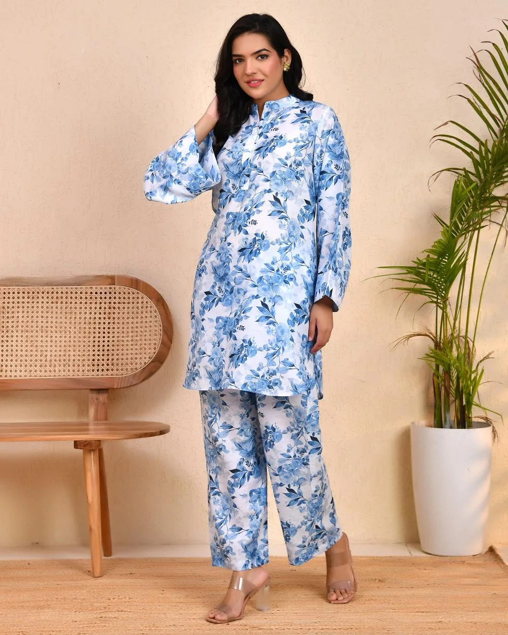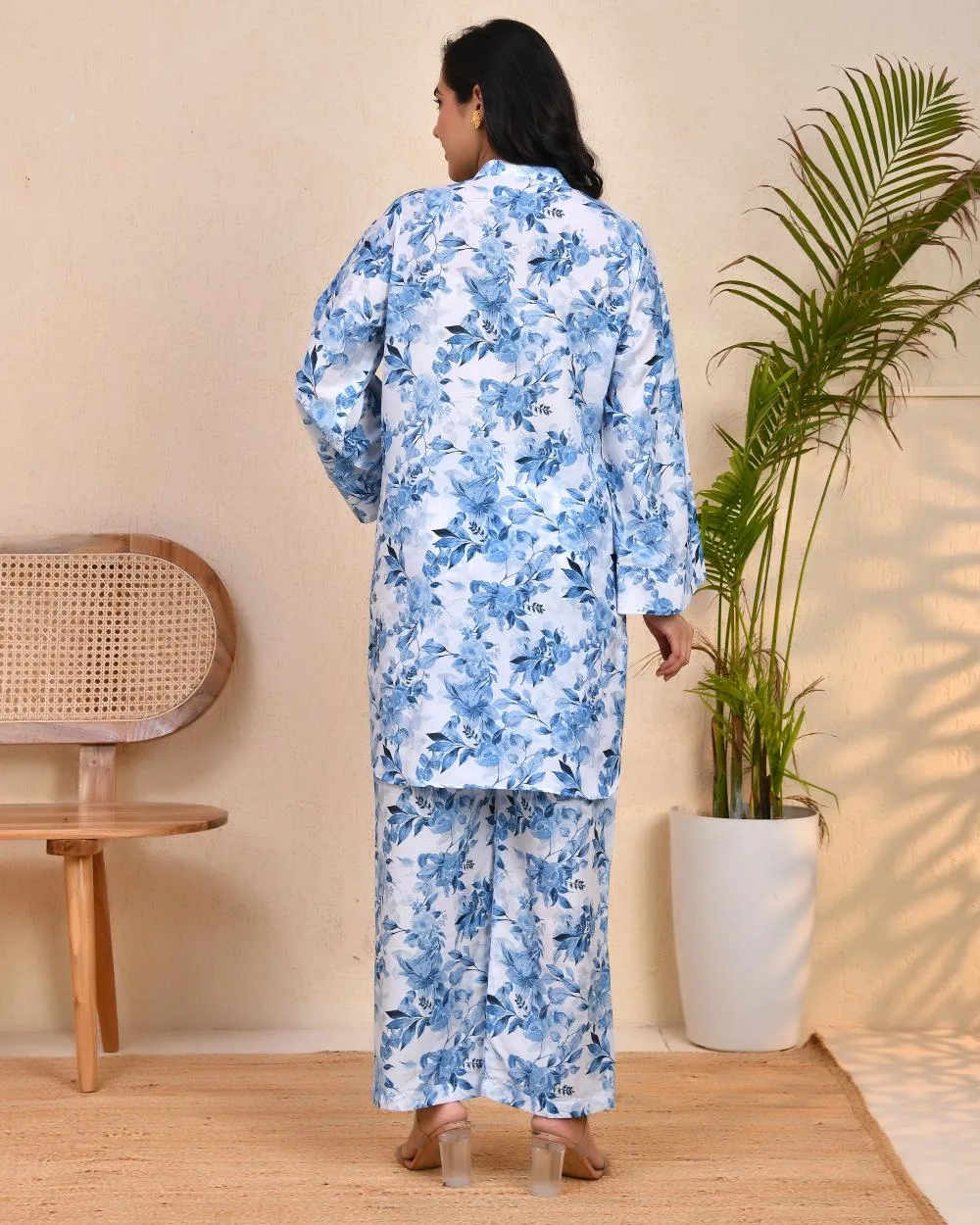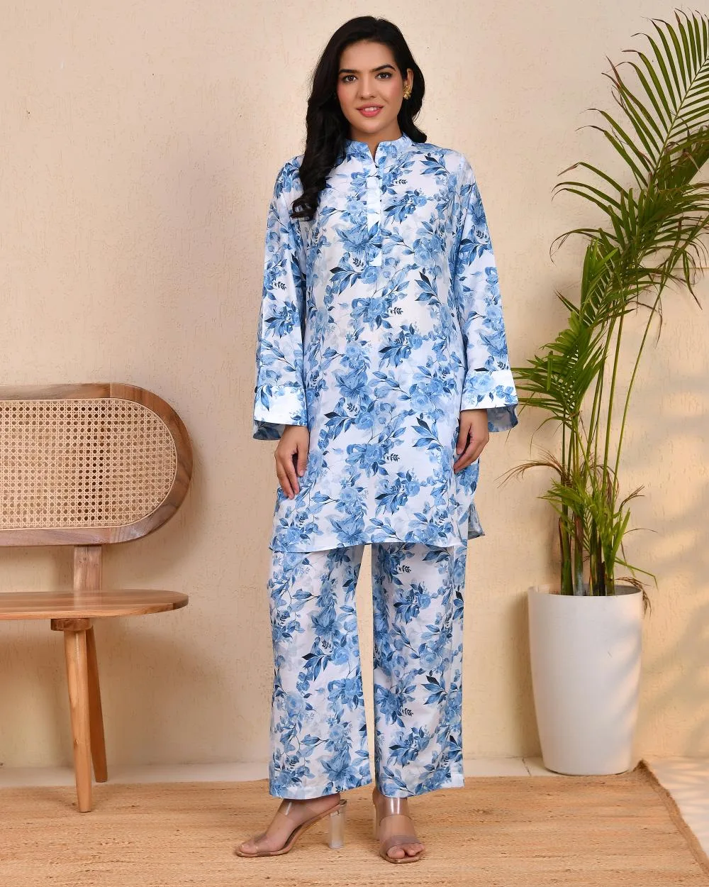Elevate your everyday style with our Blue Blossom Cotton Co-ord Set, designed for timeless elegance and supreme comfort. Featuring a straight-fit kurta with a mandarin collar and matching wide-leg pants, this set showcases a soft white base adorned with serene blue floral prints. The cotton-rich fabric feels light and breathable, making it an ideal pick for summer days, relaxed gatherings, or travel.