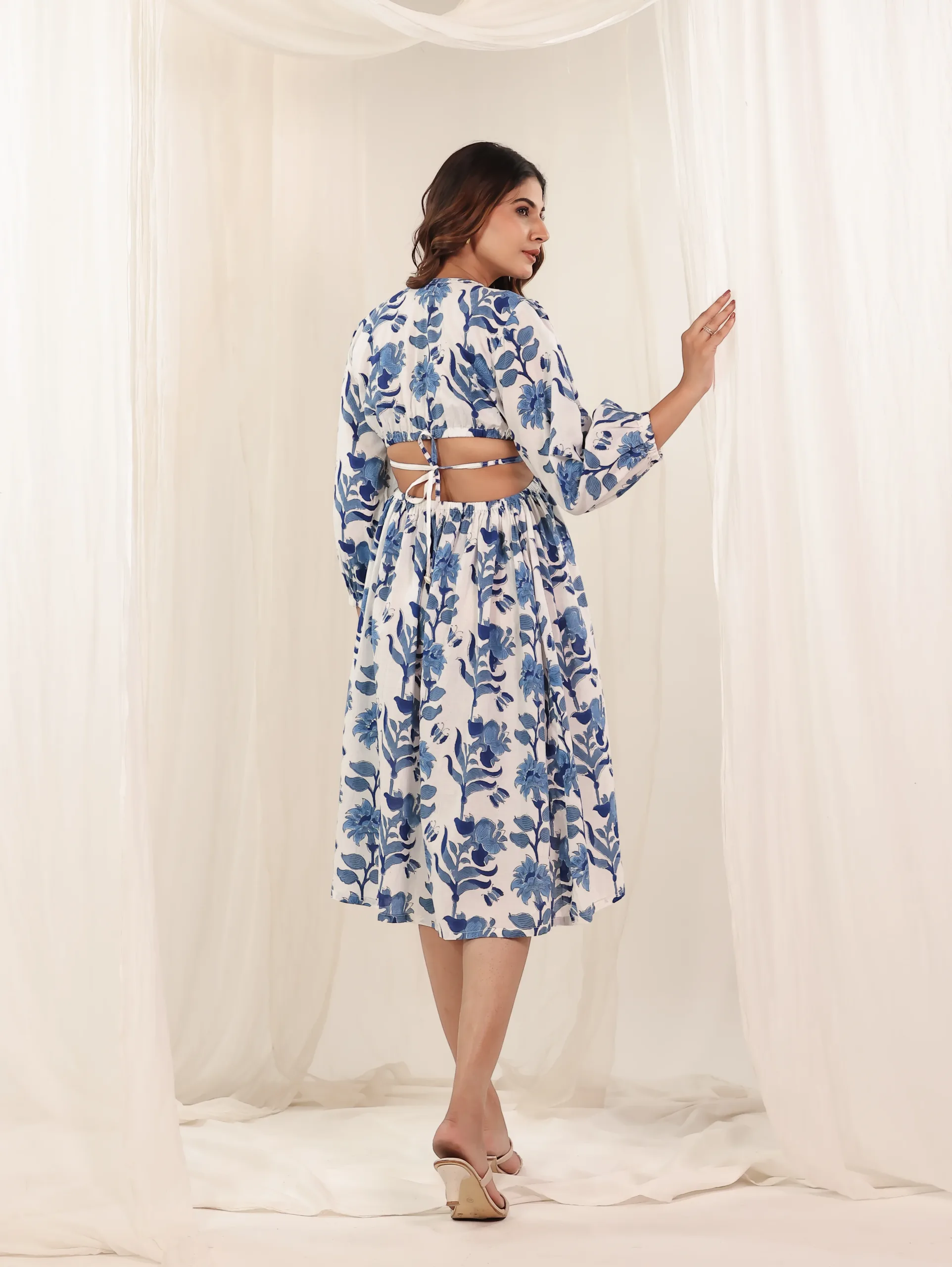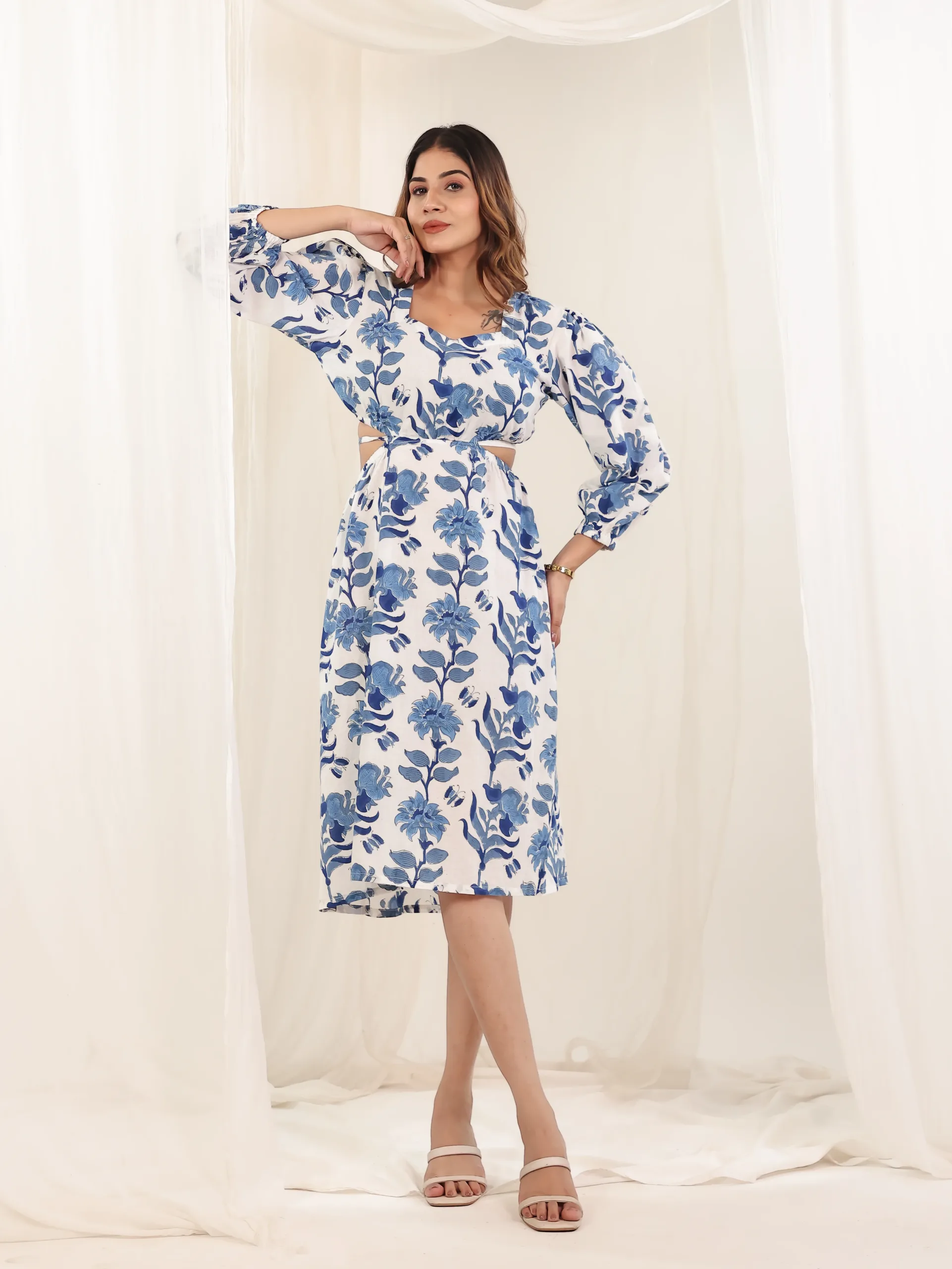 Effortlessly graceful and rooted in timeless tradition, our Blue Peony Block Print Dress is a wardrobe essential for those who love comfort with elegance. Handcrafted in soft, breathable cotton, this midi dress features a classic silhouette with a square neckline and full sleeves—perfect for everyday wear or casual outings.The rich hand block print of blue floral vines on a white base brings out the charm of artisanal craftsmanship while keeping the look contemporary and breezy.