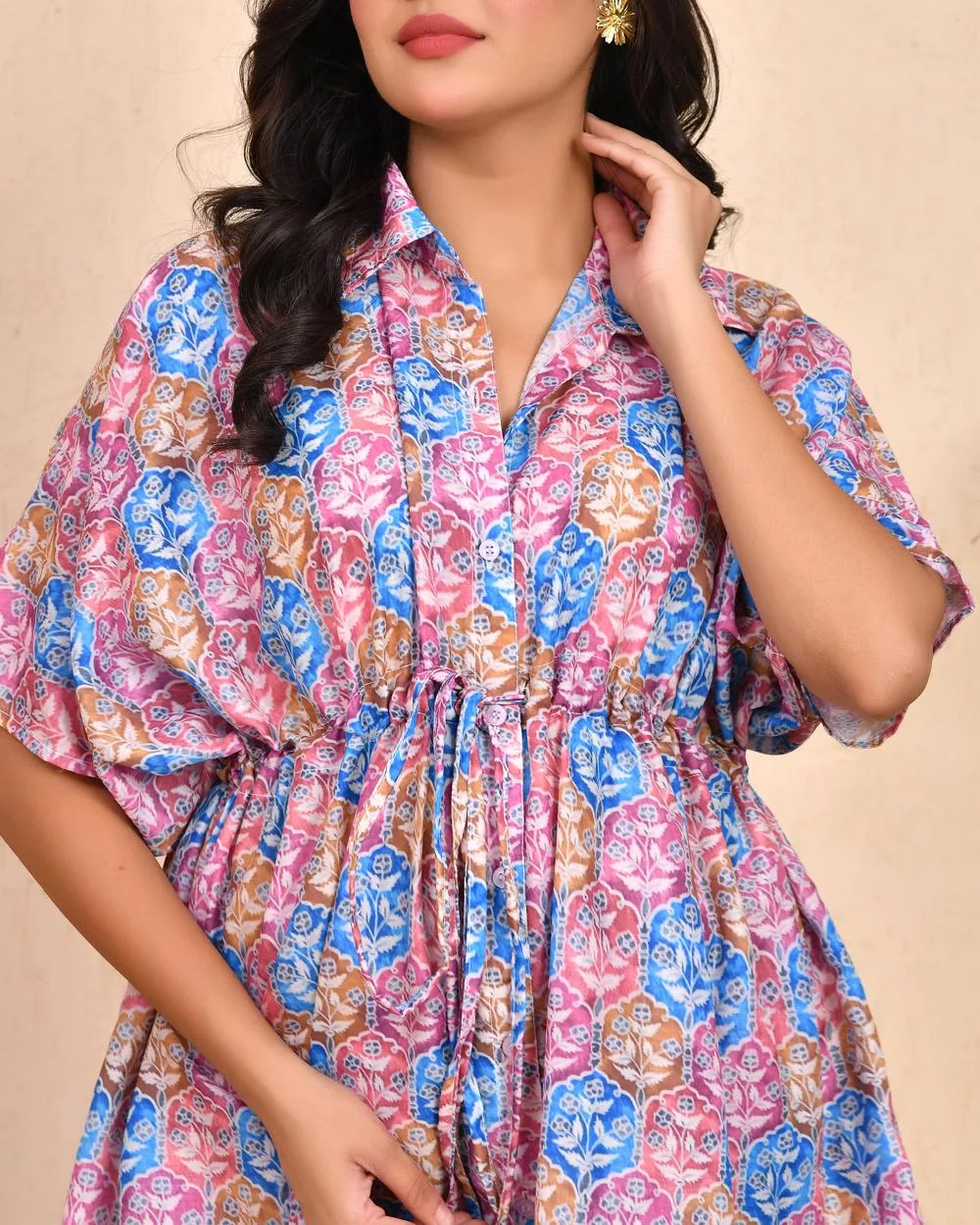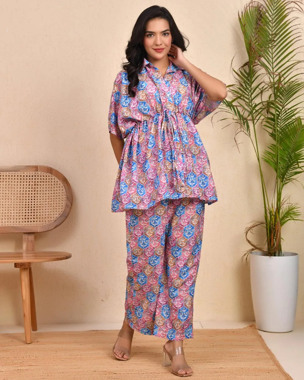 Effortless, breezy, and chic — our Boho Bloom printed co-ord set is the ultimate fusion of comfort and contemporary fashion. Designed with a vibrant all-over bohemian print in rich shades of mauve, rose pink, and royal blue, this two-piece outfit is perfect for casual outings, travel, or lounging in style.The top features a relaxed fit with a drawstring cinched waist for a flattering silhouette, while the wide-leg trousers offer unmatched ease and movement. Crafted from soft, breathable fabric, it’s your go-to for looking put-together with zero effort.