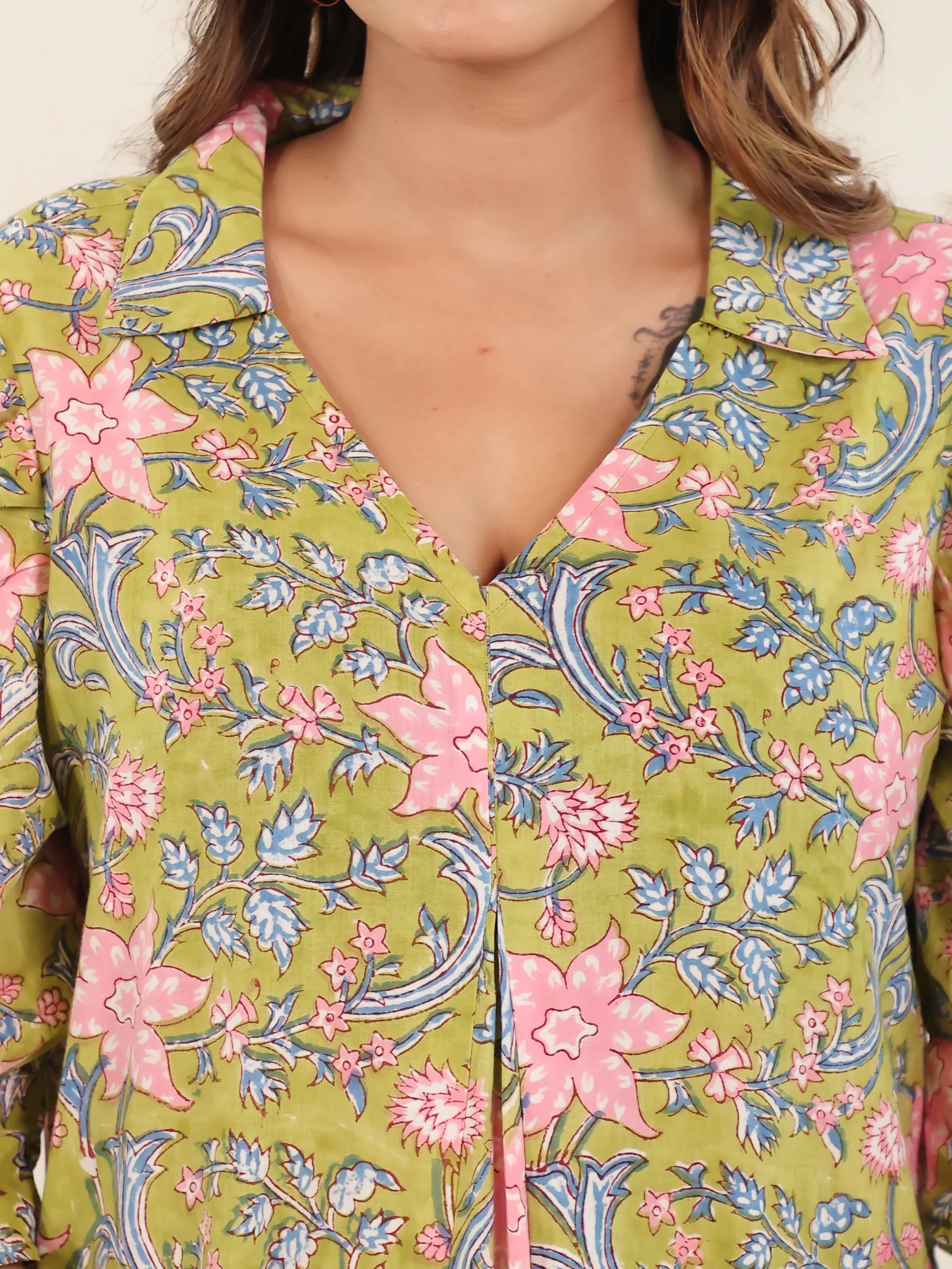 Let your style flourish with the Gulbagh Garden Bloom Dress, a refreshing blend of tradition and playfulness. This V-neck midi dress features vibrant handblock-inspired florals in pink and blue set against a cheerful lime-green base. The soft gathers below the bust offer a flattering fit while allowing free-flowing movement. With elbow-length puffed sleeves and functional buttons, this breezy cotton piece is your perfect companion for garden picnics, festive errands, or heritage holidays.