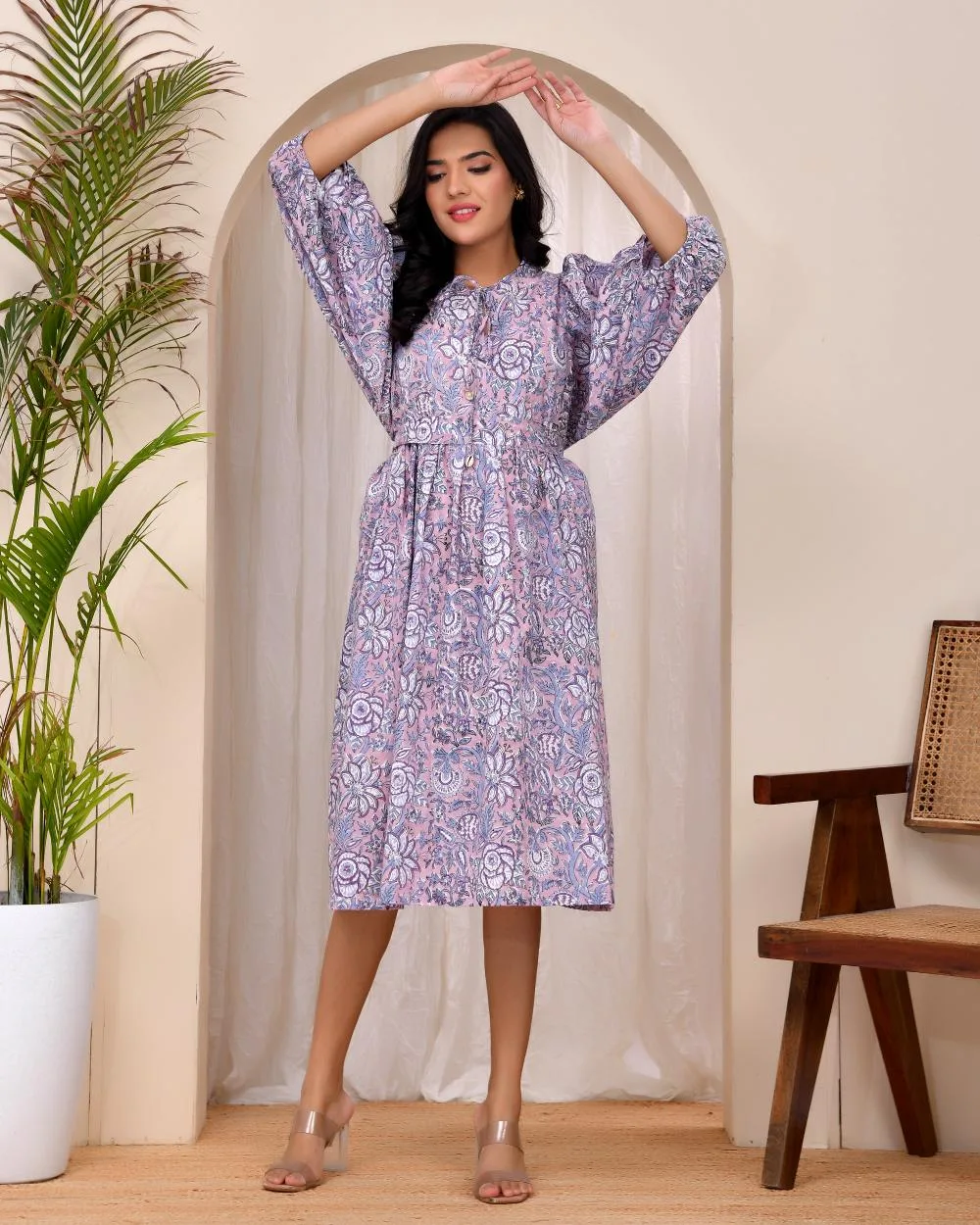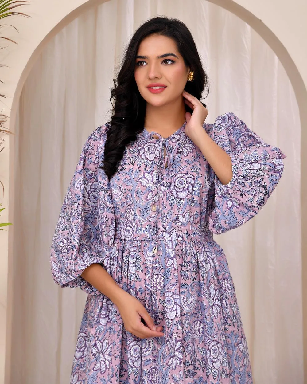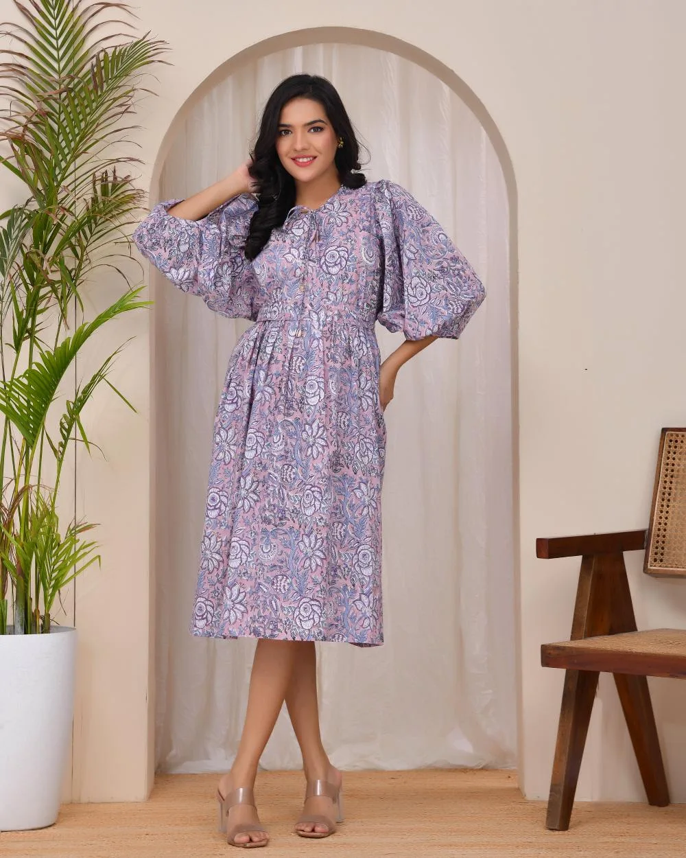 Step into subtle elegance with our Lilac Bloom Smocked Dress. Featuring a soothing lilac floral print, this midi dress is crafted in soft cotton to keep you cool and comfortable all day. The smocked bodice flatters your form while allowing flexible movement, and the voluminous 3/4th balloon sleeves add a touch of drama to its easy silhouette. A self-tie belt cinches the waist at the back, offering a perfect fit for every body type. This is your go-to for effortless everyday chic.