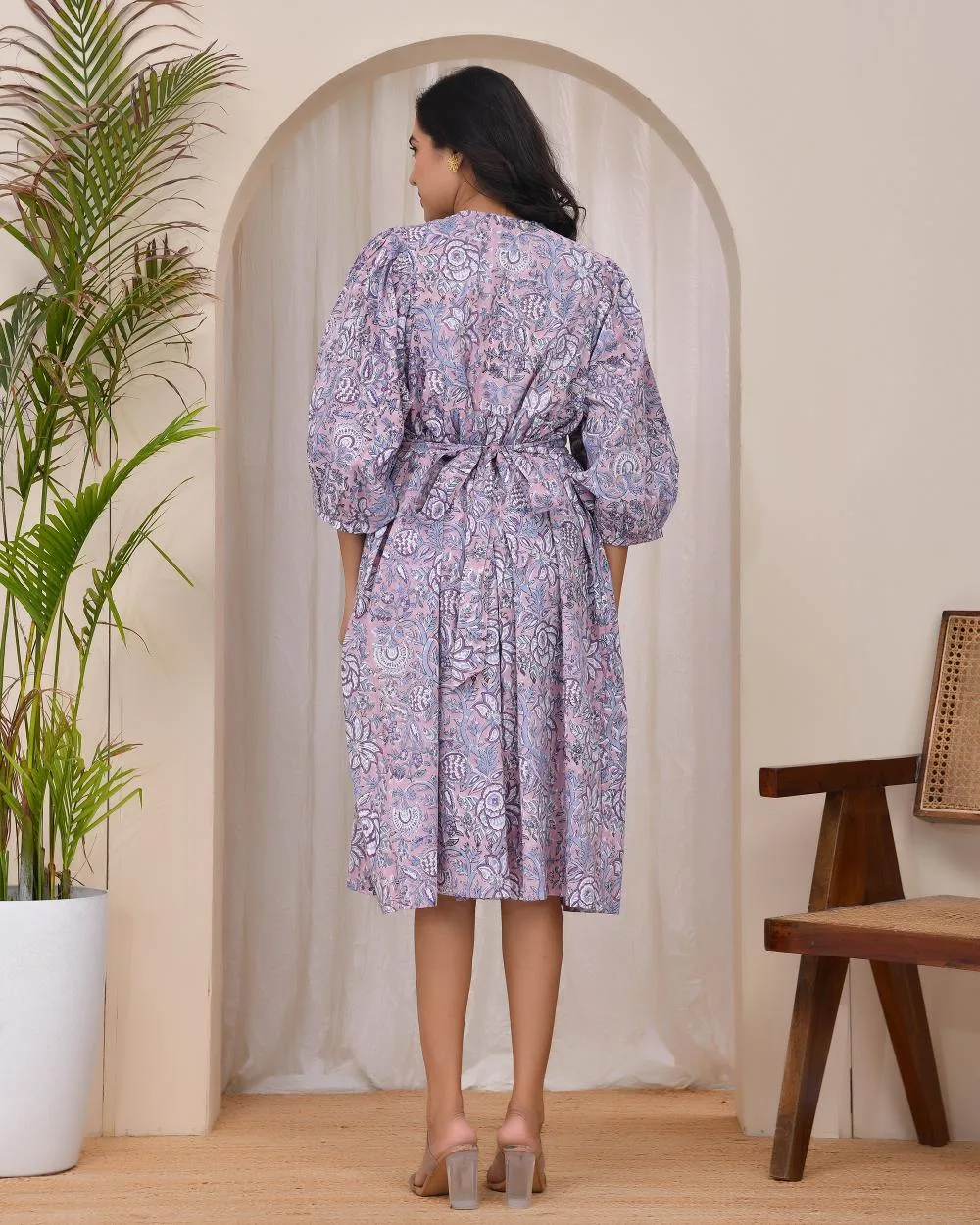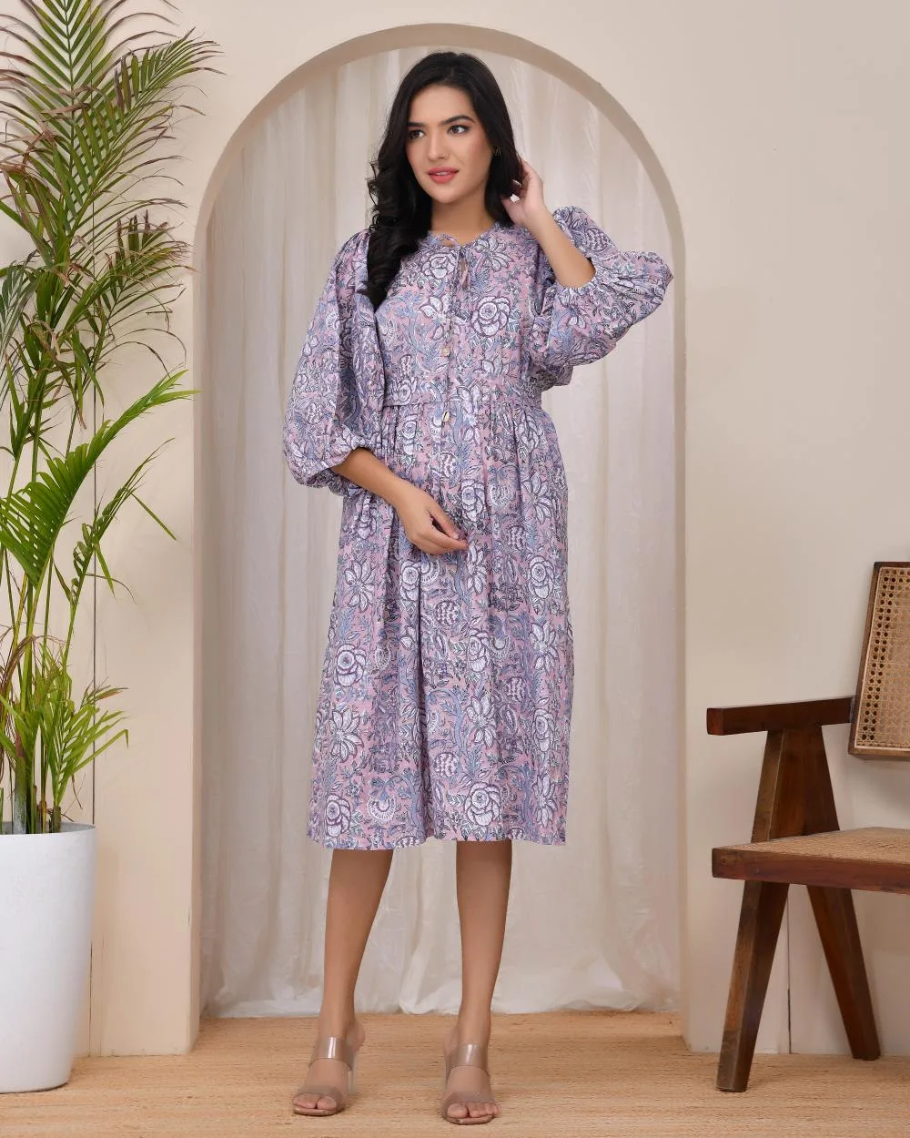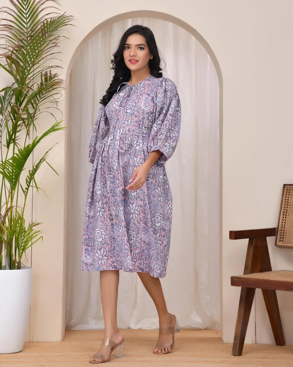 Step into subtle elegance with our Lilac Bloom Smocked Dress. Featuring a soothing lilac floral print, this midi dress is crafted in soft cotton to keep you cool and comfortable all day. The smocked bodice flatters your form while allowing flexible movement, and the voluminous 3/4th balloon sleeves add a touch of drama to its easy silhouette. A self-tie belt cinches the waist at the back, offering a perfect fit for every body type. This is your go-to for effortless everyday chic.