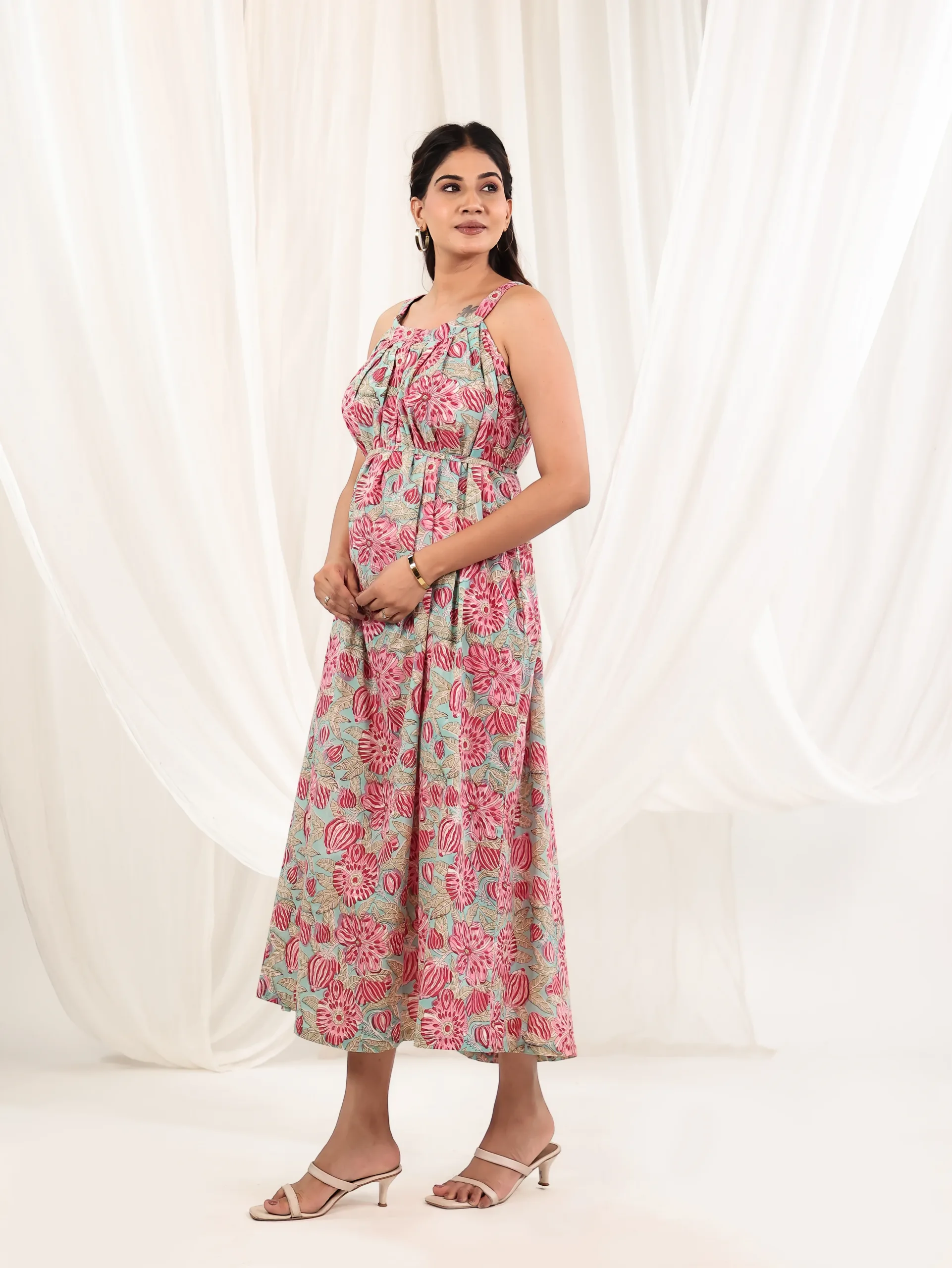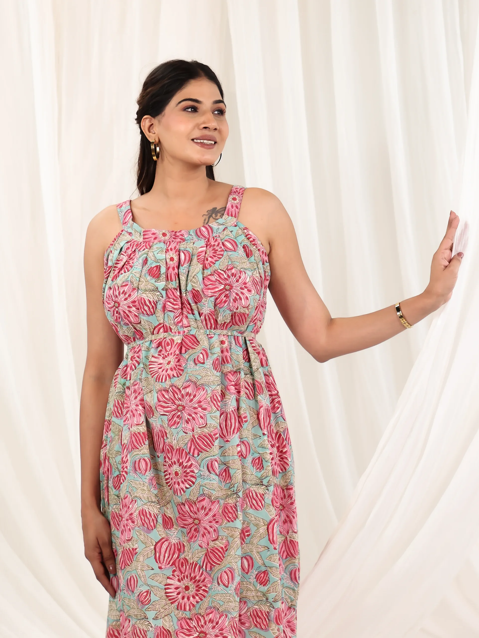 Let your style bloom in the Lotus Mist Halter Maxi Dress — a breezy, effortless ensemble that channels grace and sunshine. Crafted in soft cotton, this flowy dress features a relaxed halter neckline with subtle gathers for a flattering drape. The soothing grey base is adorned with vibrant lotus motifs in shades of coral pink and aqua, making it an easy pick for resort days, garden brunches, or dreamy holiday escapes.