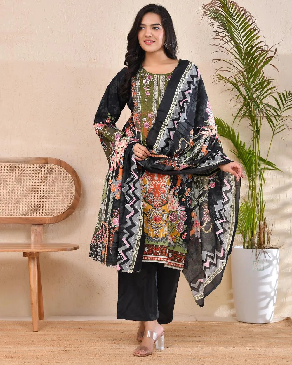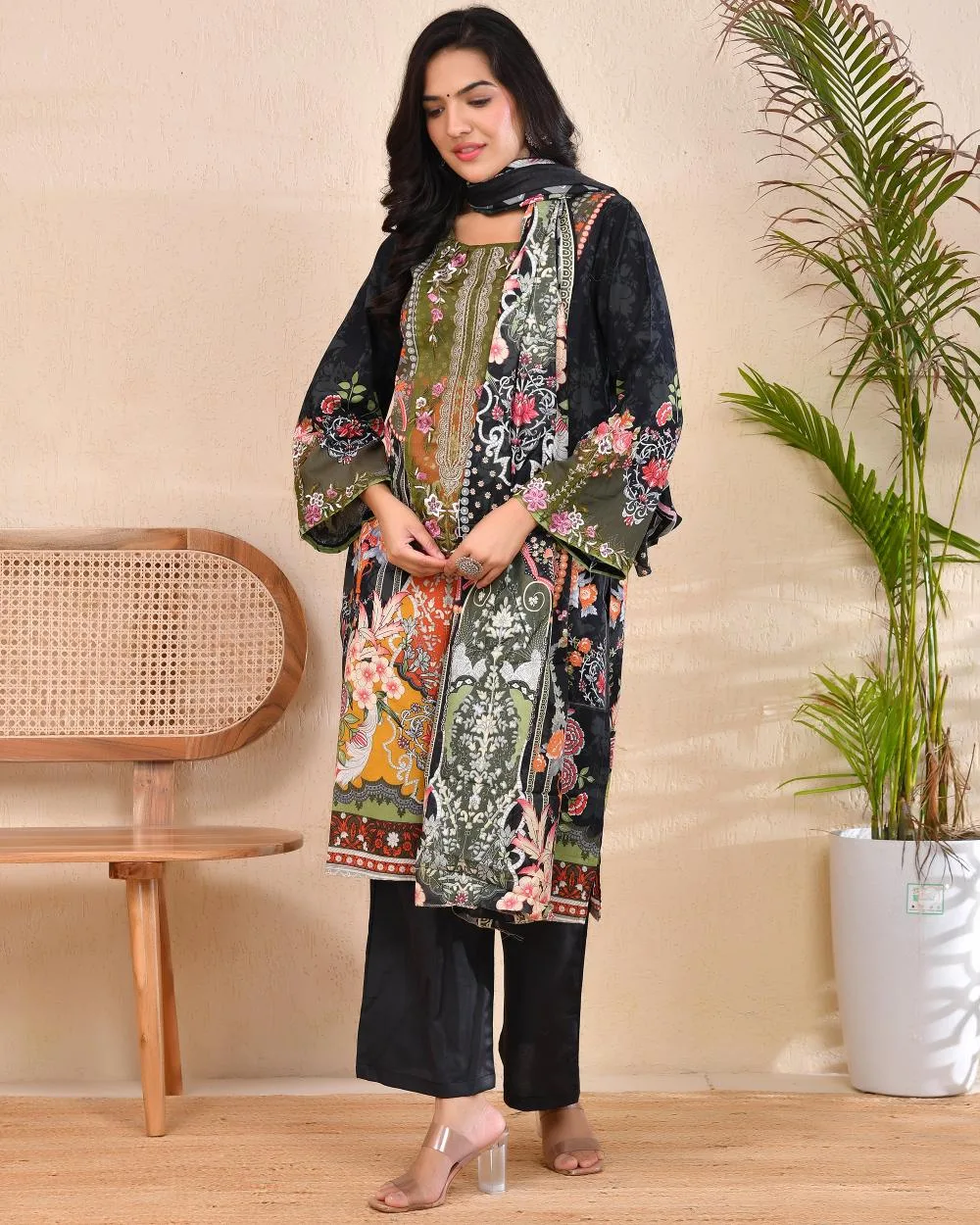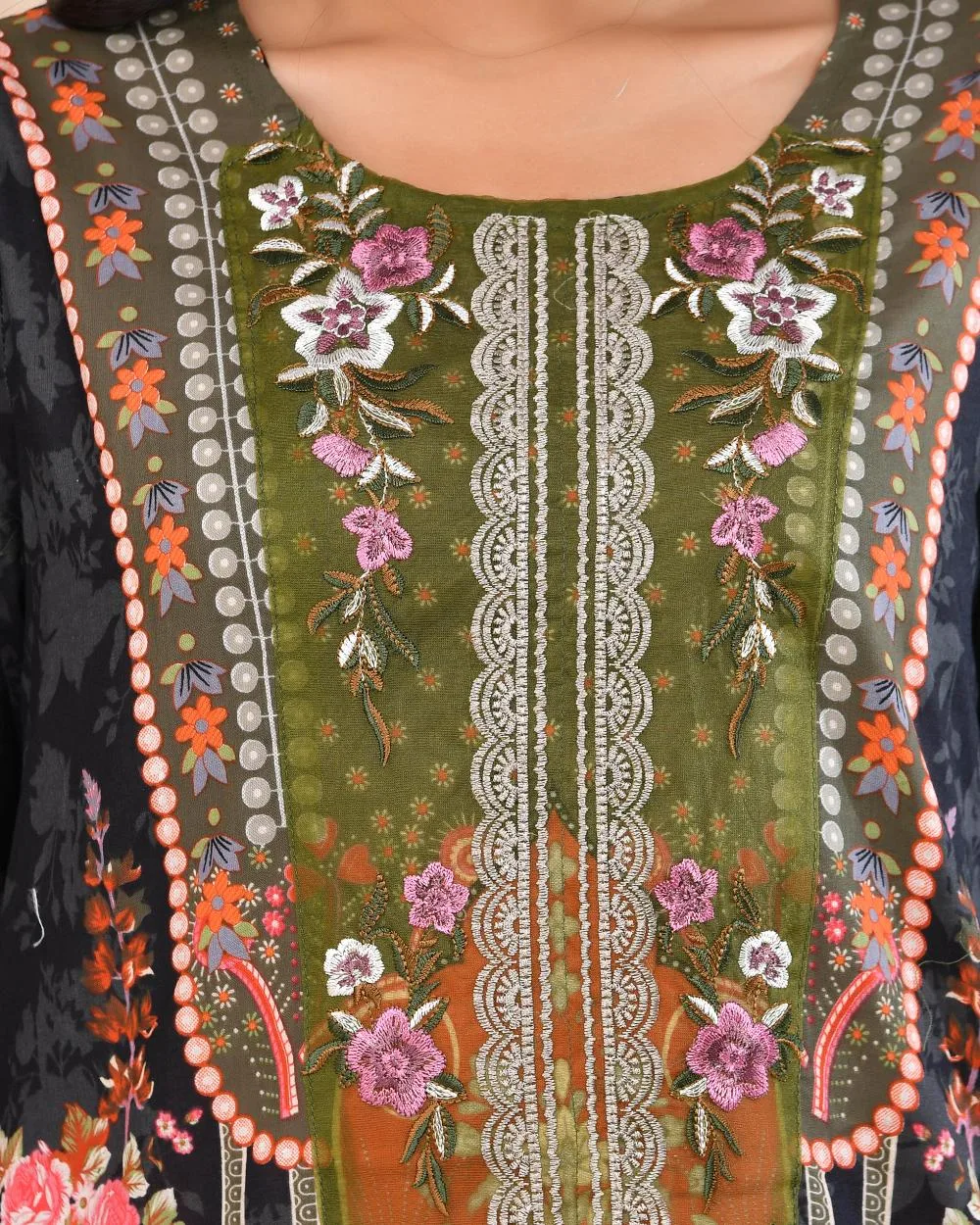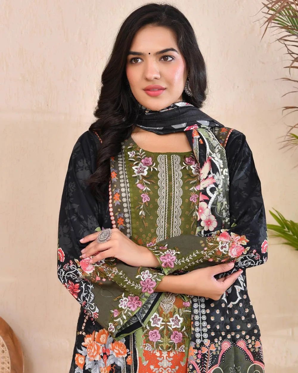 Make a bold style statement with our Midnight Bloom embroidered lawn suit, a captivating fusion of dramatic florals and modern patterns. This black kameez is adorned with multicolor floral embroidery, highlighted by olive green undertones and intricate threadwork running vertically for a slimming effect. The wide sleeves feature delicately embroidered cuffs that add sophistication to the overall design.Paired with sleek black trousers for a timeless silhouette, the ensemble is elevated by a beautifully printed cotton dupatta. Featuring vibrant floral bursts, chevron accents, and paisley motifs, the dupatta ties the look together with flair and flow.