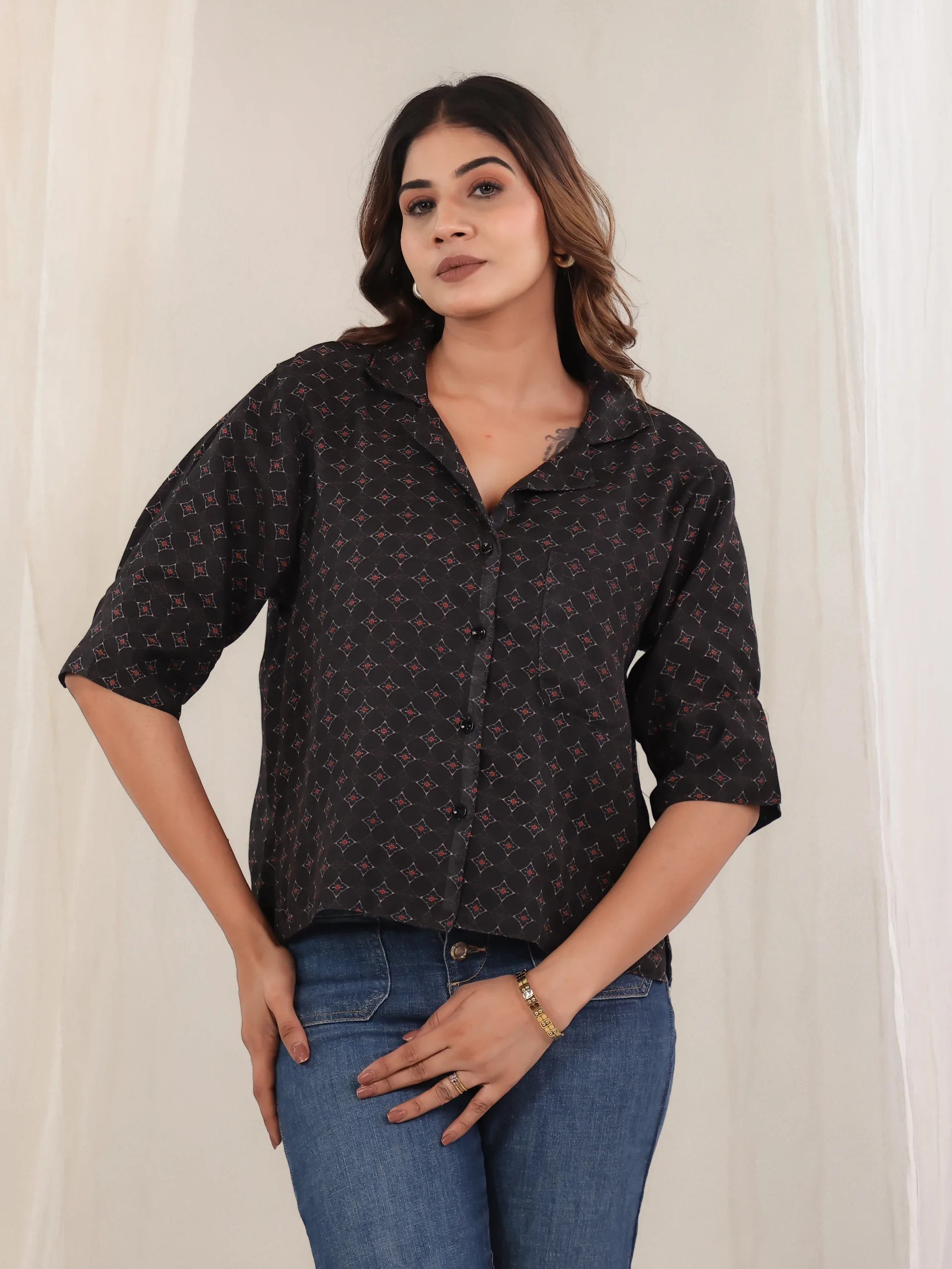 A perfect balance of classic and contemporary — our Midnight Mosaic Printed Shirt Top adds effortless sophistication to your everyday look. Crafted in soft Cotton-Linen, it features a rich black base adorned with intricate geometric motifs in subtle shades of red and beige. The collared neckline, button-down front, and easy 3/4 sleeves create a timeless silhouette that flatters every shape while keeping you at ease all day.