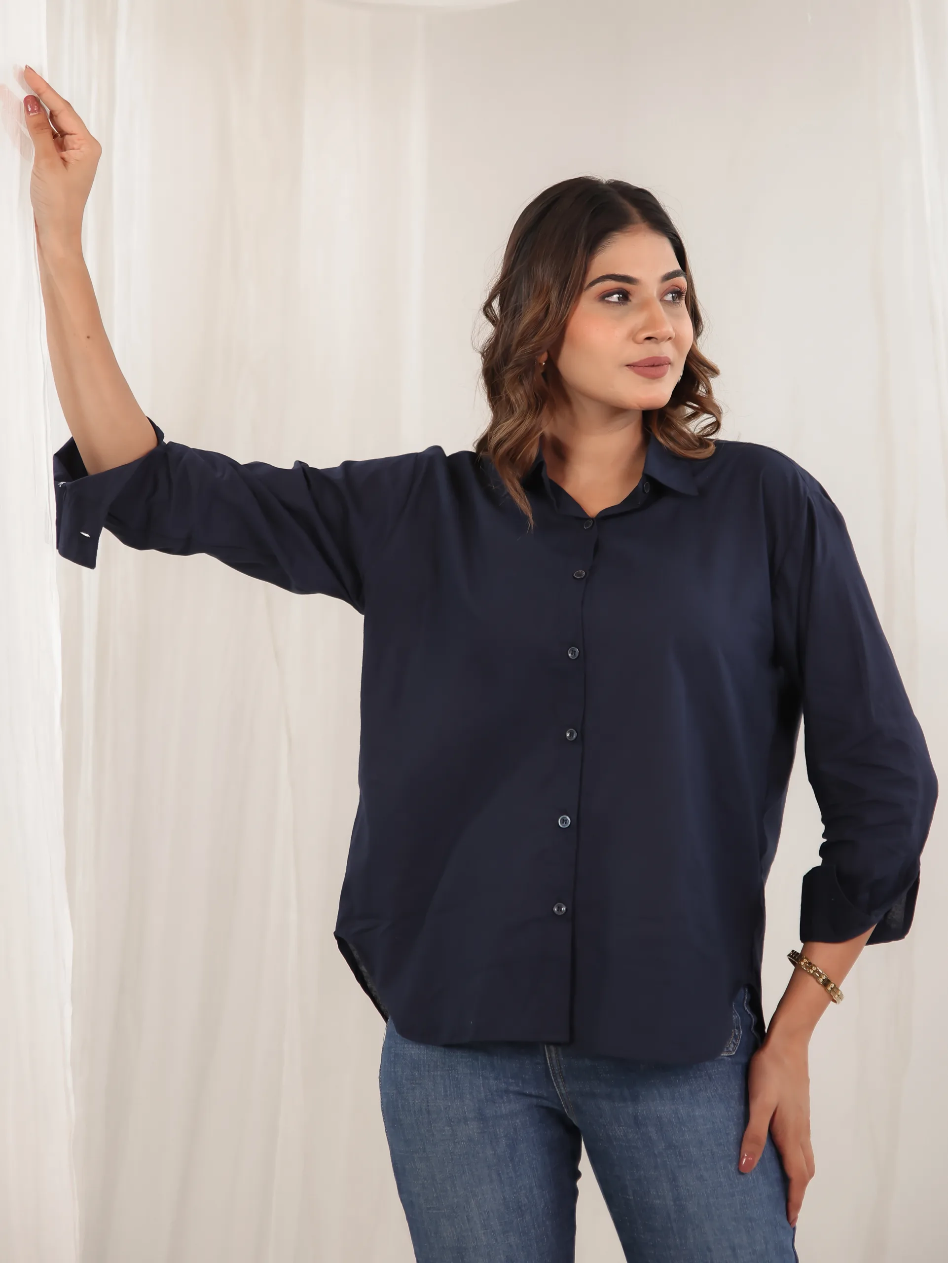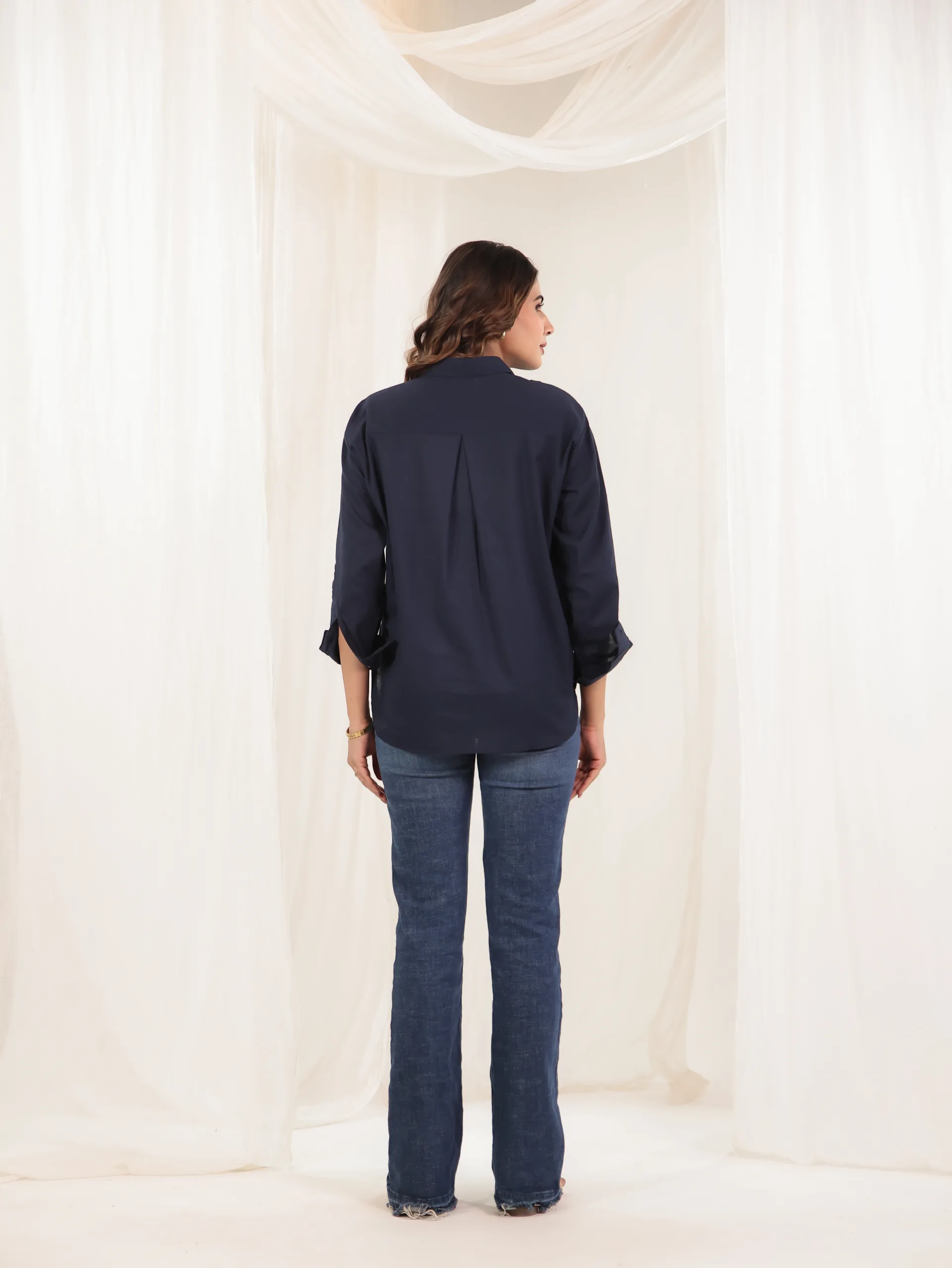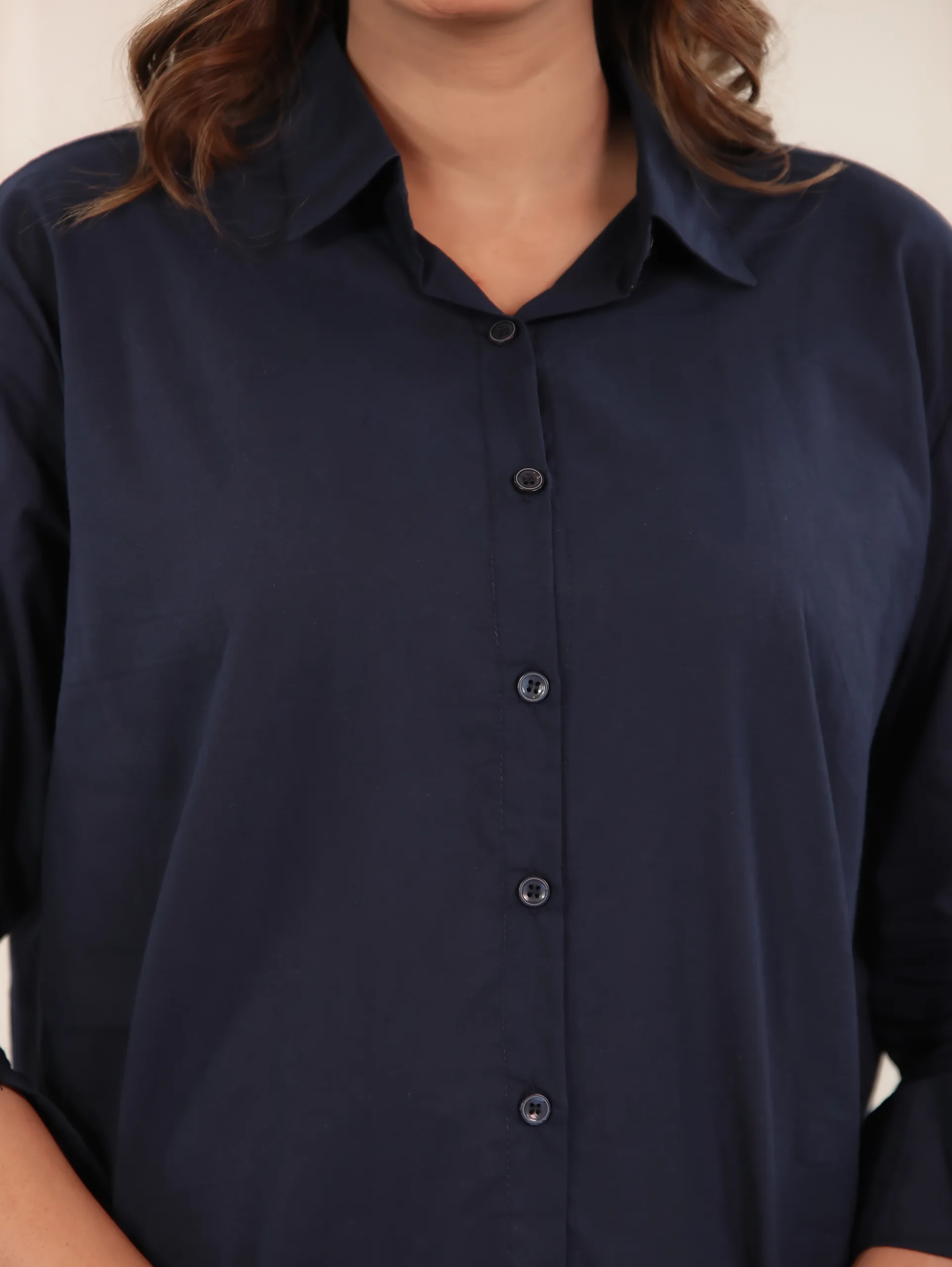 Understated elegance meets everyday comfort in our Midnight Poise Shirt. Crafted in a deep navy hue, this relaxed-fit shirt exudes effortless sophistication. Designed with a classic button-down front and soft drape, it’s the perfect piece to transition from day to night with ease. The lightweight fabric ensures all-day comfort while the clean silhouette adds a timeless appeal.