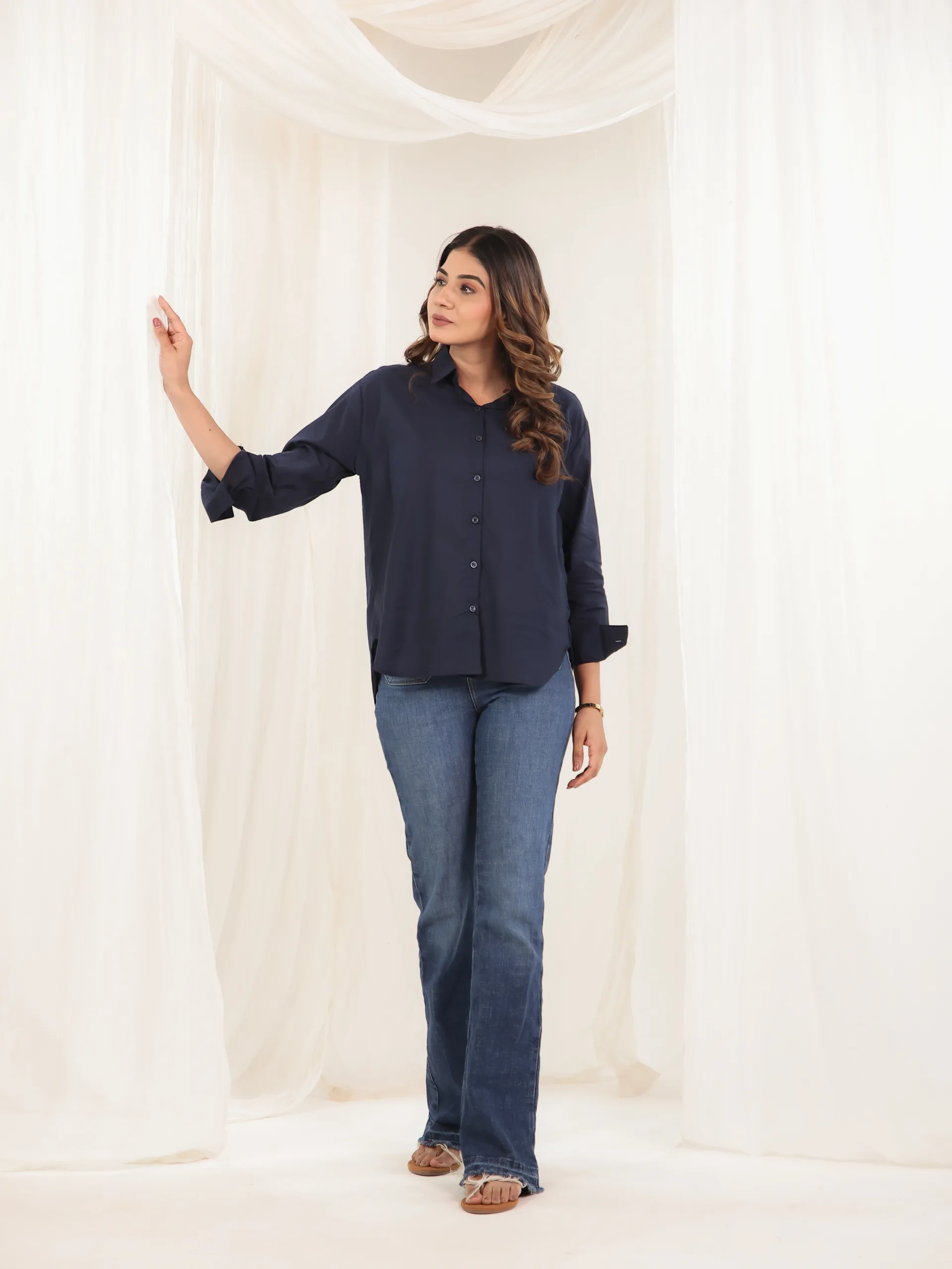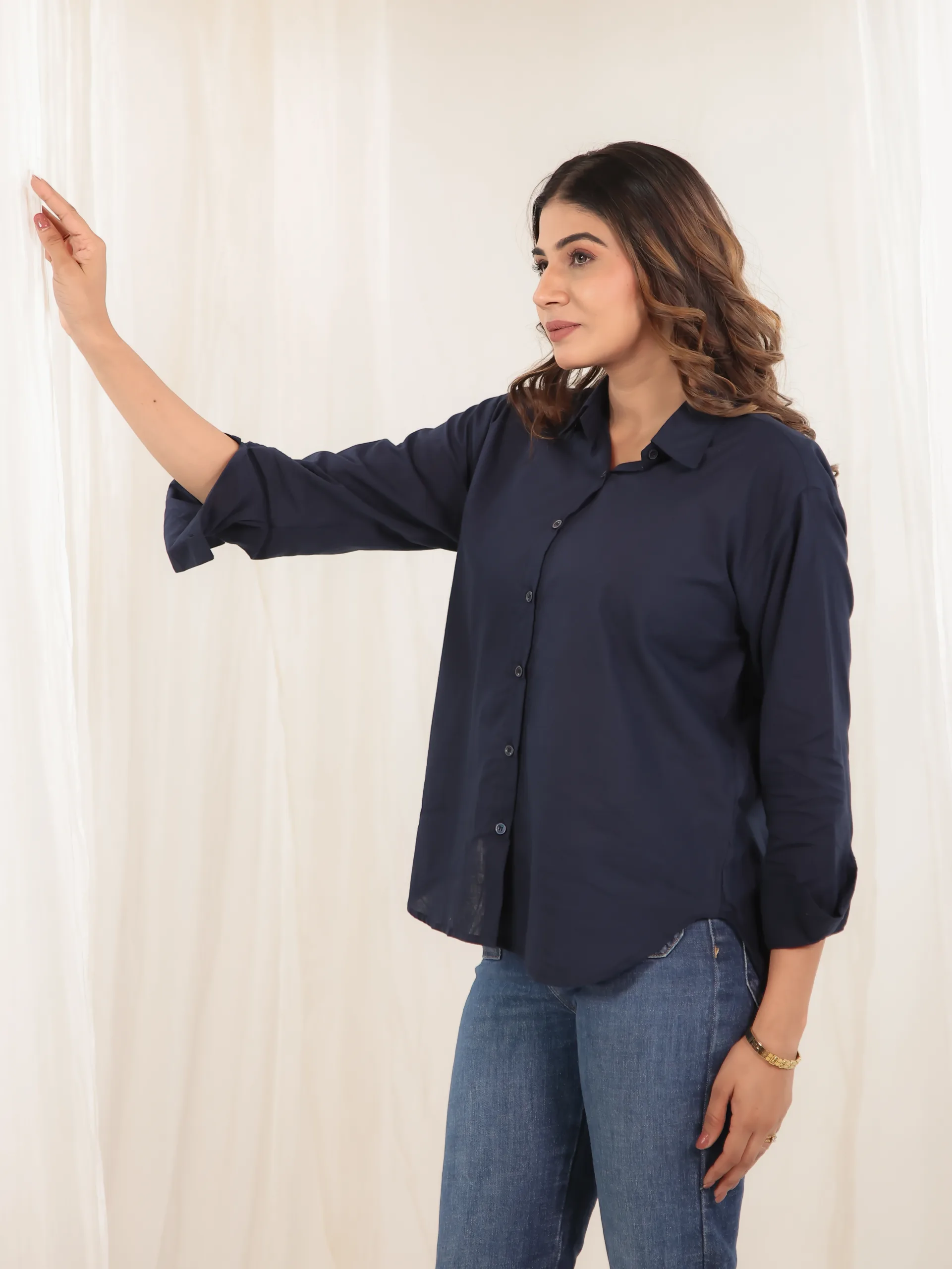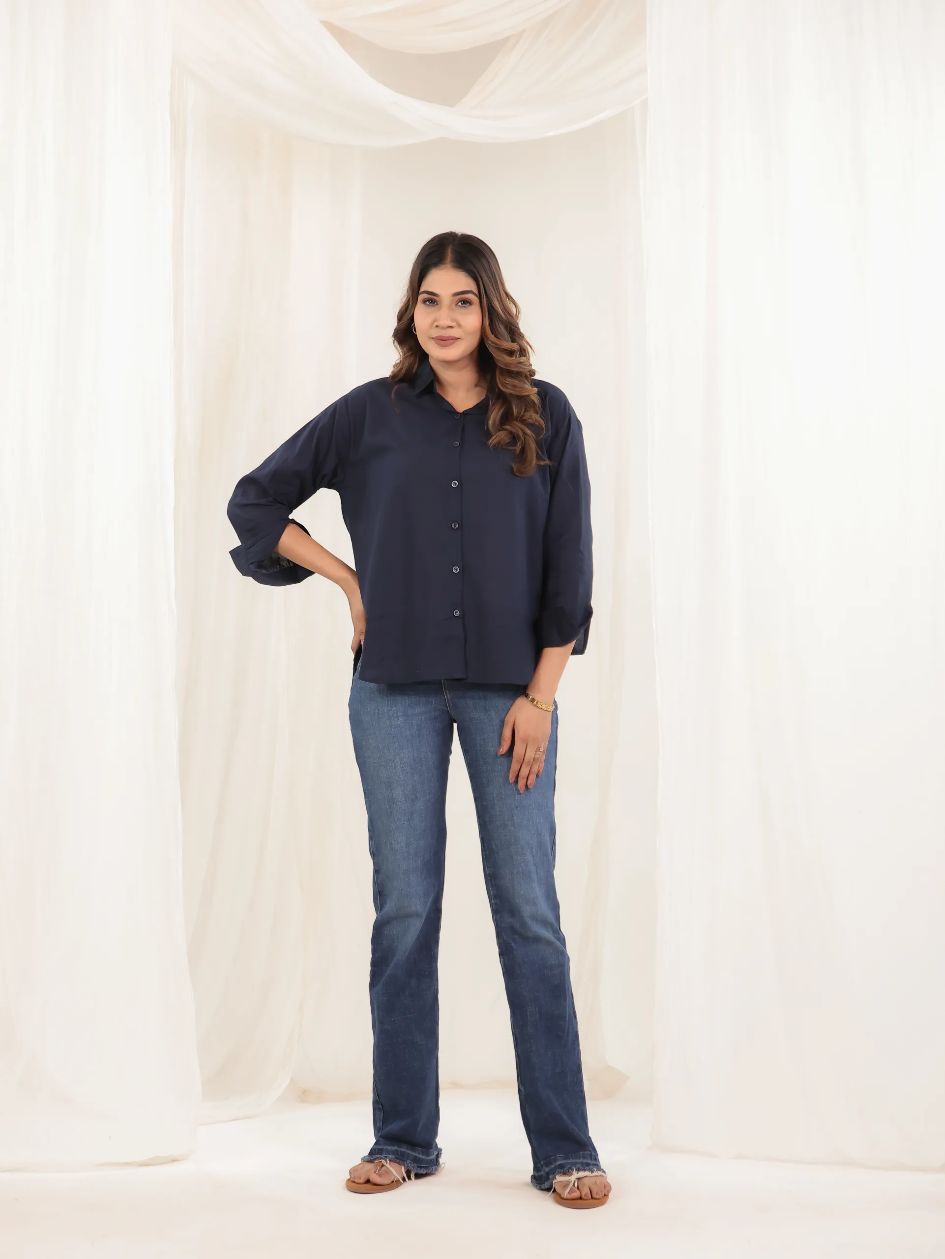 Understated elegance meets everyday comfort in our Midnight Poise Shirt. Crafted in a deep navy hue, this relaxed-fit shirt exudes effortless sophistication. Designed with a classic button-down front and soft drape, it’s the perfect piece to transition from day to night with ease. The lightweight fabric ensures all-day comfort while the clean silhouette adds a timeless appeal.