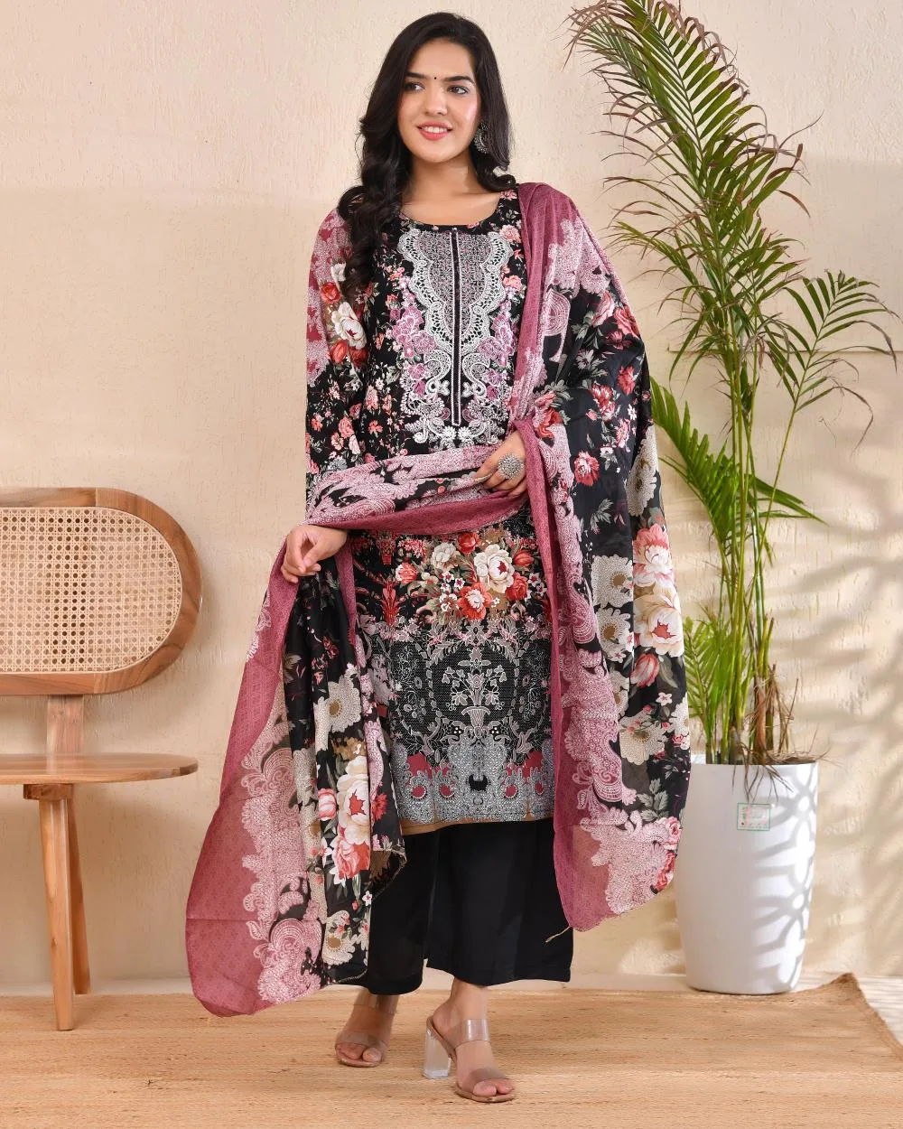 Command attention with the timeless beauty of our Noir Elegance embroidered lawn suit. Crafted in a deep black base with bursts of burgundy and ivory florals, this ensemble is a celebration of bold femininity and refined tradition. The shirt is adorned with intricately embroidered baroque motifs and floral patterns, lending a luxurious finish to the neckline, sleeves, and hem.The set includes a pair of solid black trousers that ground the look in elegance, and a cotton dupatta featuring rich burgundy borders and blooming florals in cream and blush tones. A perfect pick for evening soirées, family gatherings, or cultural events where style speaks louder than words.