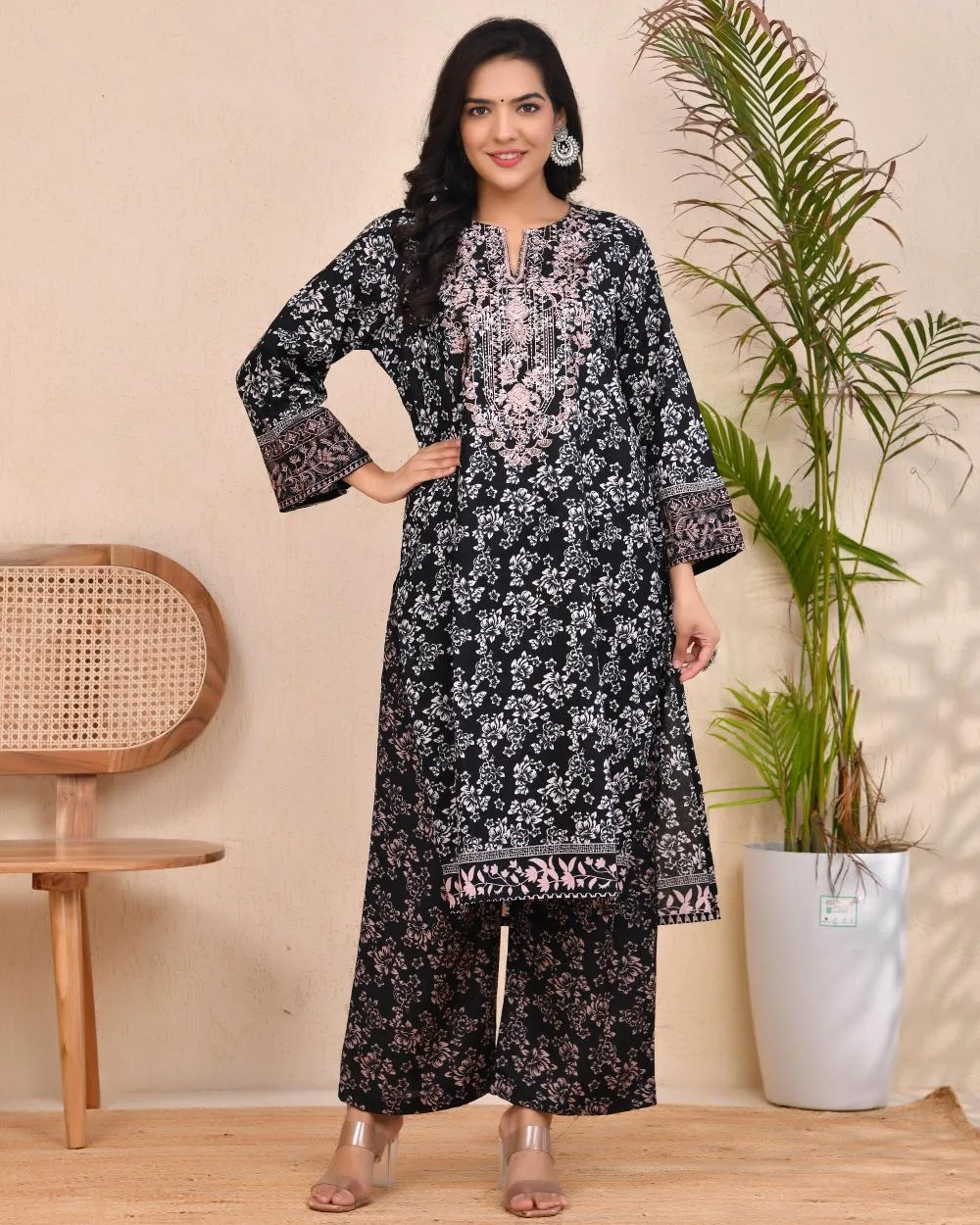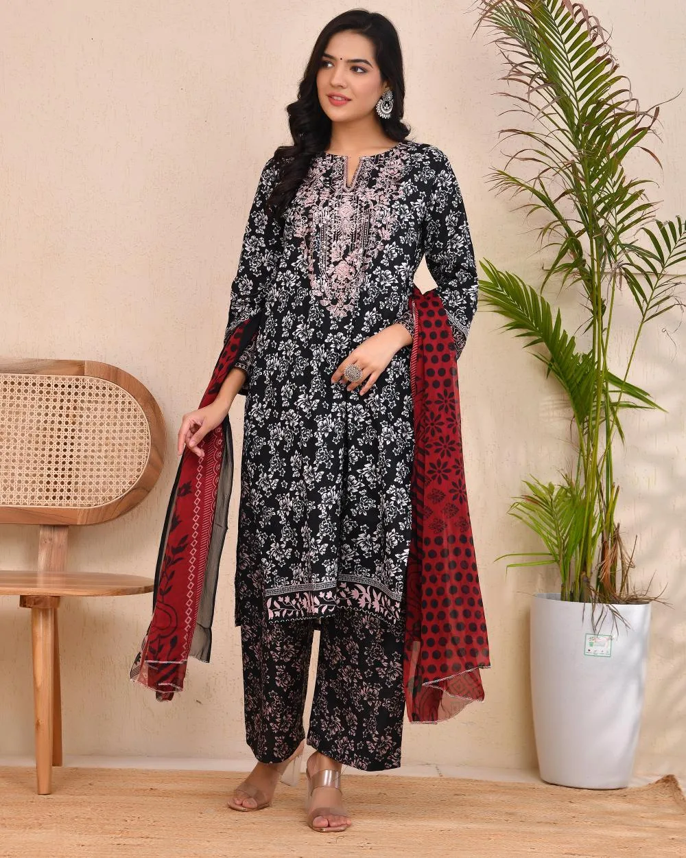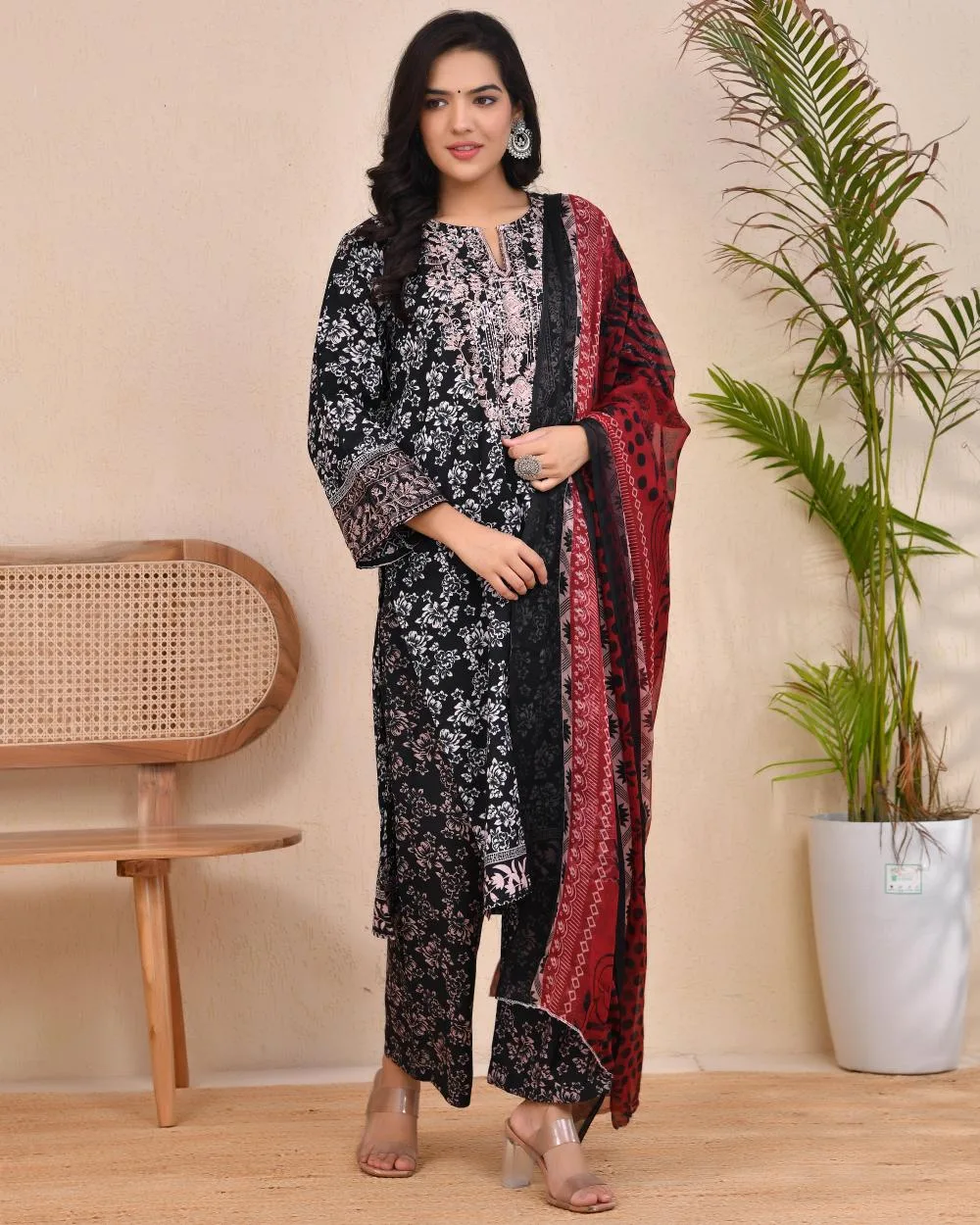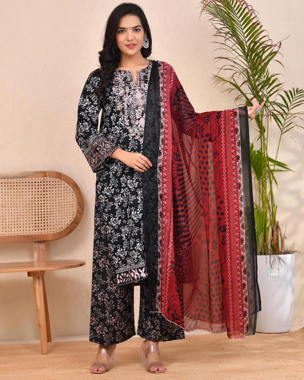 Make a striking style statement with our Noir Elegance Lawn Suit, a timeless blend of bold hues and intricate prints. The black base of the kurta and trousers is adorned with detailed white floral patterns, offering a classic monochrome look that never goes out of style.Paired with a contrasting red and black printed chiffon dupatta, the ensemble adds a rich touch of drama, perfect for festive evenings or graceful daytime wear. The kurta features a modest neckline with subtle embellishments, while the flared sleeves enhance its contemporary charm.