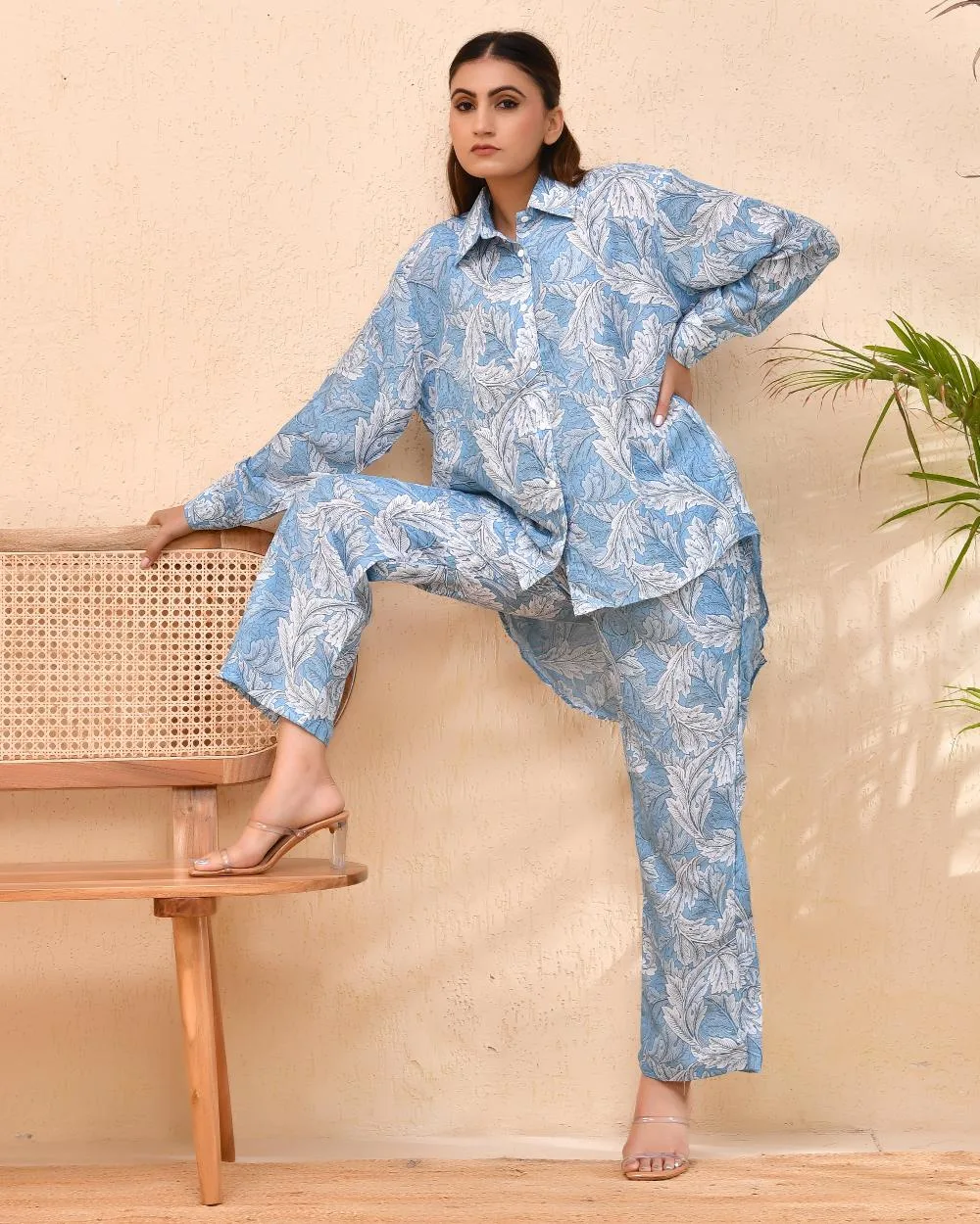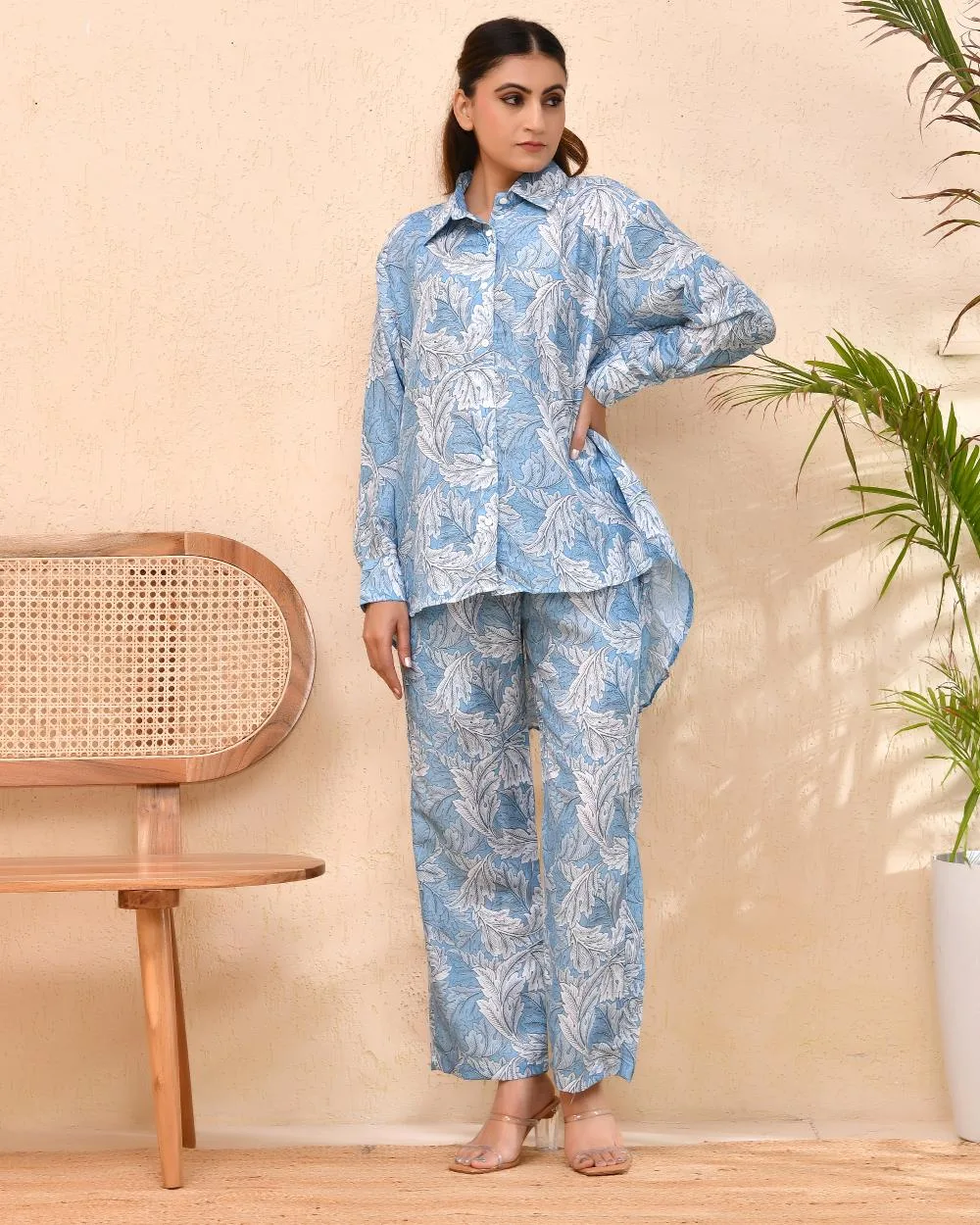 Breathe freshness into your everyday wardrobe with our Ocean Leaf Co-ord Set. Drenched in calming shades of blue and adorned with an elegant leafy print, this relaxed-fit set is a must-have for lovers of effortless fashion. The button-down shirt features a crisp collar and long sleeves, while the matching straight-cut pants ensure all-day comfort with their airy silhouette. Whether you’re stepping out or staying in, this set brings a blend of chic and comfort to your look.
