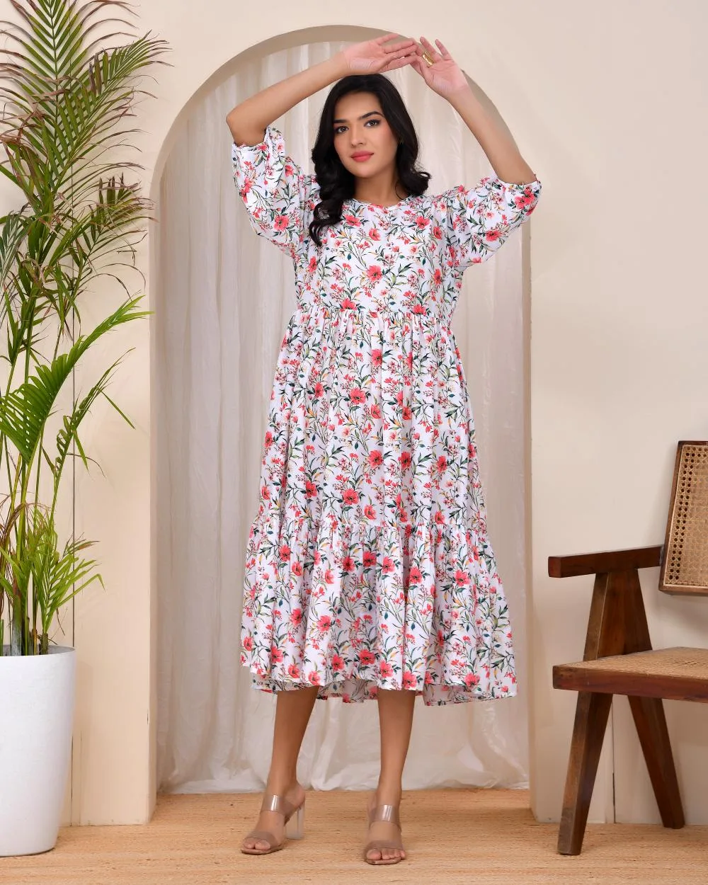 Let your wardrobe blossom with our Petal Bloom Muslin digtal print Dress, a delightful fusion of charm and comfort. This midi dress features a soft white base adorned with delicate pink and coral floral prints — perfect for brightening up your day. The puffed sleeves and tiered silhouette give it a flowy, feminine flair that’s equal parts playful and graceful.