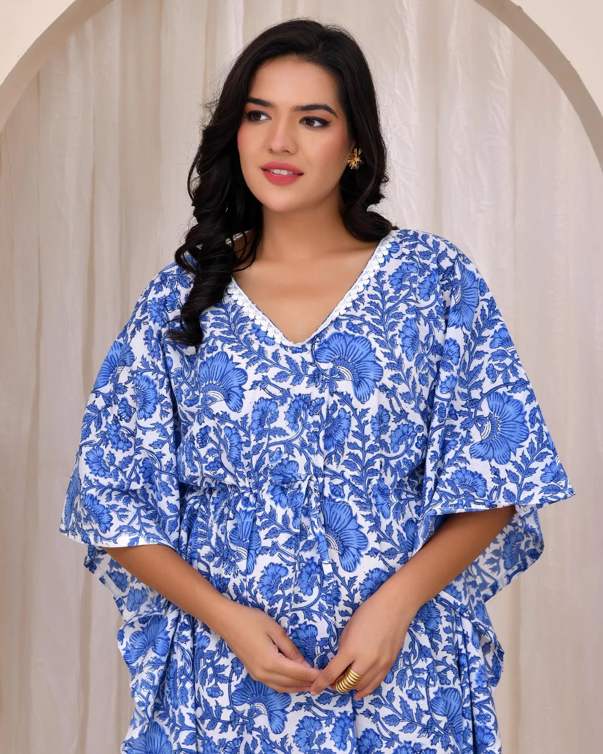 Turn everyday comfort into a statement with our Royal Botanica Cotton Kaftan. Featuring a vibrant royal blue floral pattern on a crisp white backdrop, this kaftan is crafted from 100% breathable cotton to keep you cool, stylish, and at ease all day long.The free-flowing silhouette, soft V-neckline, and relaxed sleeves are paired with a drawstring waist for customizable fit — offering just the right balance between laid-back luxury and flattering design. Finished with delicate lace detailing at the neckline, this kaftan is ideal for lounging, resort getaways, or casual brunches.