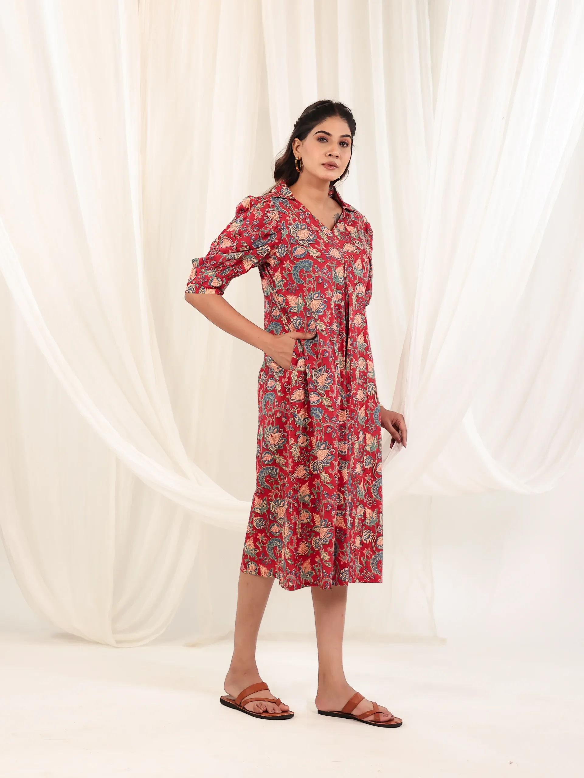 Scarlet Garden Gathered Midi Dress – Cotton Comfort