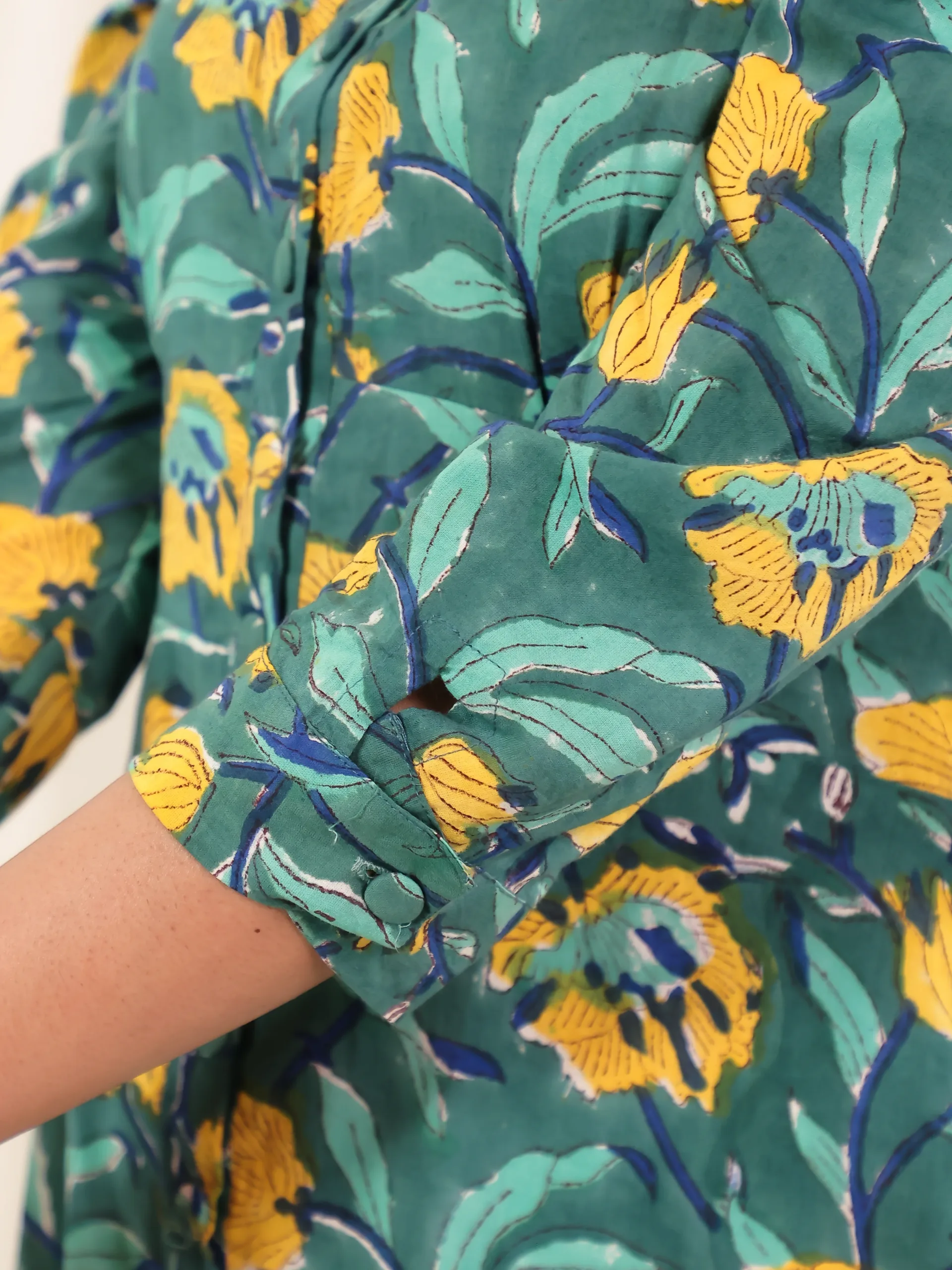 Celebrate bold botanicals with the Teal Meadow Button-Down Dress, a vibrant fusion of structure and softness. Crafted in rich teal cotton and adorned with mustard and emerald floral block prints, this midi dress makes a striking statement. The V-neckline, pleated shoulders, and full button-down front give it a tailored charm, while the A-line silhouette and front slit add an easy flow for all-day wear.