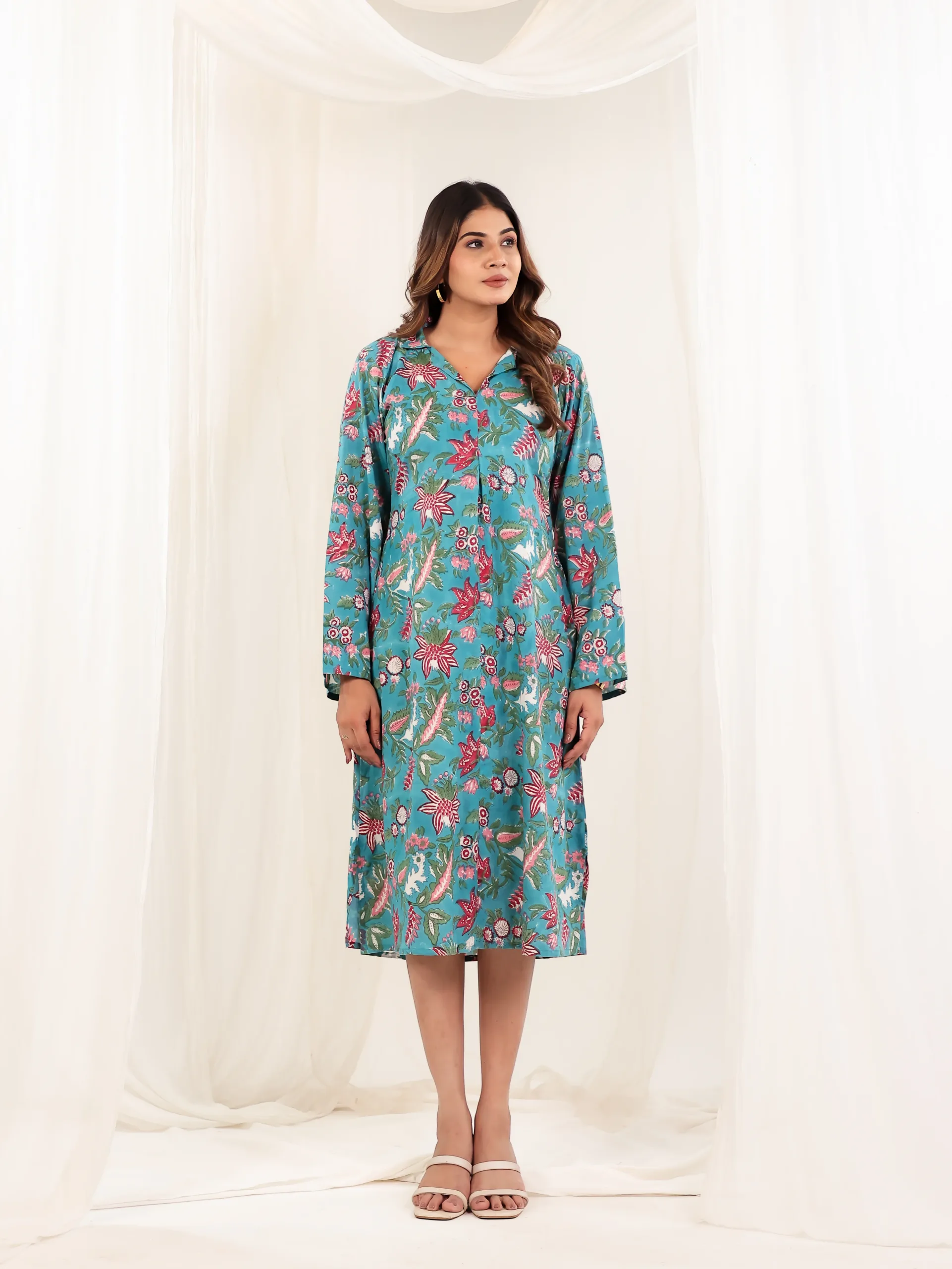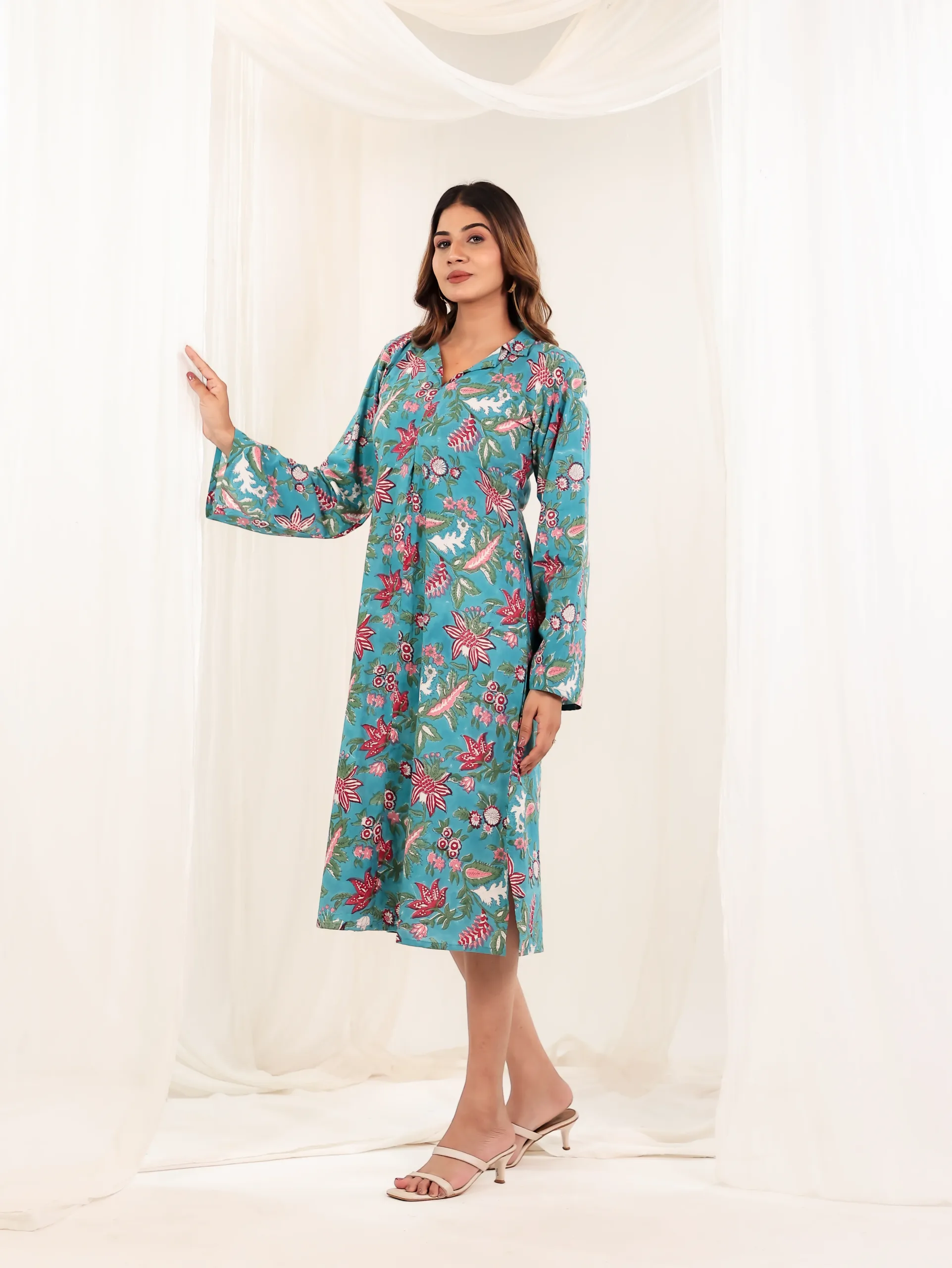 Step into effortless charm with our Tropical Bloom Cotton Dress, a refreshing blend of vibrant florals and breathable comfort. Crafted from soft, skin-friendly cotton, this teal blue Dress features an all-over tropical-inspired floral print in shades of pink, white, and green, bringing lively elegance to your everyday wardrobe.The relaxed A-line silhouette, V-neckline, and full sleeves offer a flattering fit that’s both modern and modest. Wear it solo as a breezy summer dress — versatility never looked this pretty!