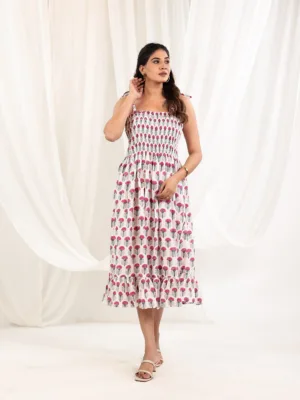 • Red & Brown Handblock Printed Cotton Midi Dress